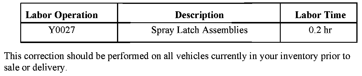 This correction should be performed on all 2005 Buick Allure and LaCrosse; 2004- 2005 Cadillac CTS and SRX; 2005 Cadillac STS; 2004-2005 Chevrolet Malibu (New Style) and Malibu Maxx; and 2005 model year Equinox vehicles currently in your inventory. This service should be performed prior to sale or delivery, but no later than March 31, 2005. On January 7, 2005, the plants began lubing latches so any vehicles received after January 28, 2005 will not require lubrication.