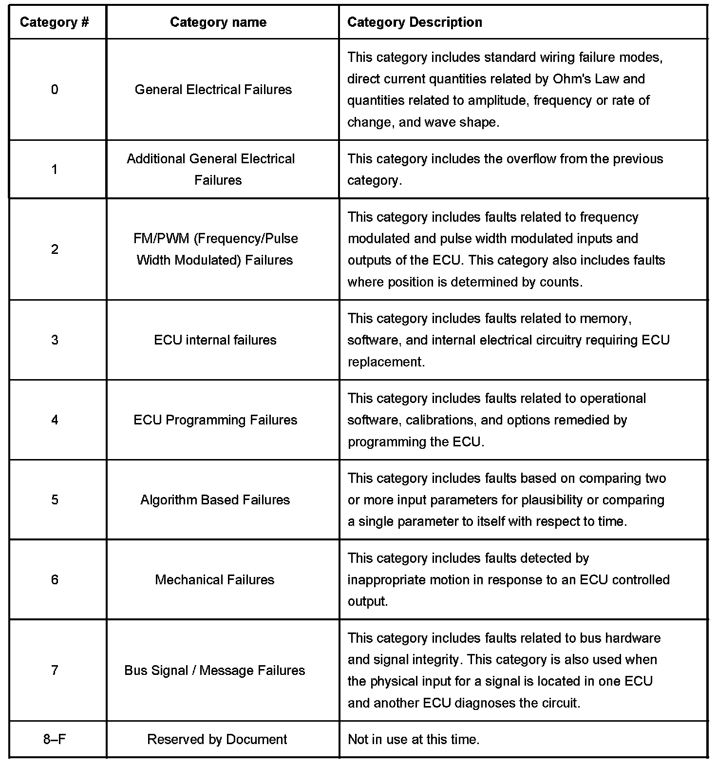 The DTC symptom is made up of 2 alphanumeric digits. The first digit following the DTC indicates the DTC symptom category. There are 16 possible categories available in the range of 0 through the letter F. Currently there are 8 categories in use, 0 through 7. These 8 categories together with their definitions are given below.