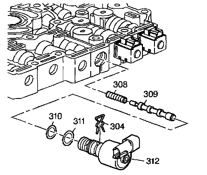 1. Install the torque signal regulator spring (308), the torque signal regulator valve (309), the Pressure Control Solenoid (PCS) with two O-rings and screen (312, 309, 310) and the PCS retainer clip (304)