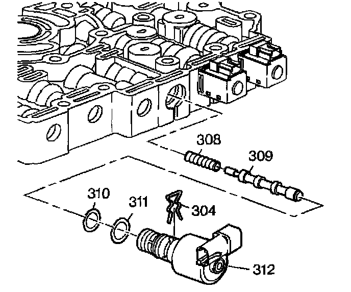 2. Remove the Pressure Control Solenoid (PCS) retainer clip (304), the PCS with two O-rings and screen (312, 309, 310), the torque signal regulator valve (309), and the torque signal regulator spring (308).