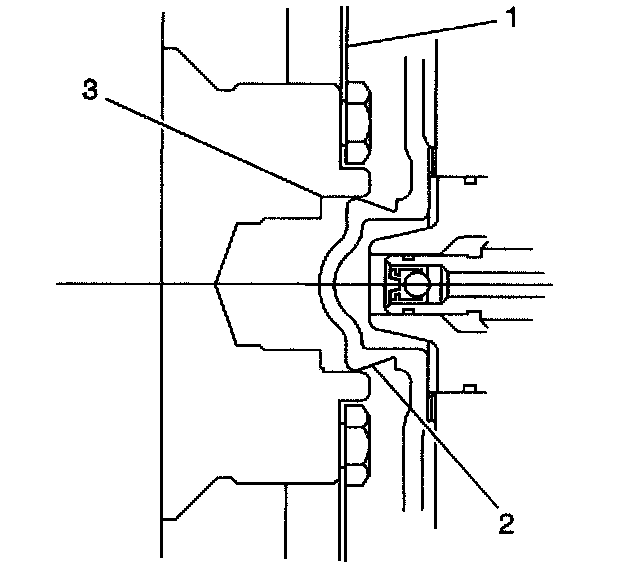 3. Align the torque converter hub (2) in the engine crankshaft (3) and install the torque converter to flywheel bolts.