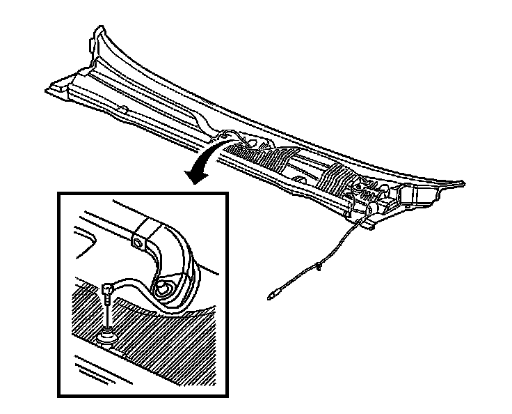 2. Install the windshield washer hose to the air inlet grille panel. Ensure that the hose is seated into the retaining features on the air inlet grille panel.