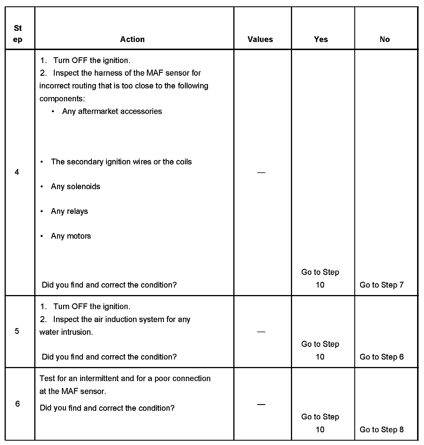 - Inspect the air induction system for any water intrusion. The water rapidly cools the hot sensing elements in the sensor causing a false indication of excessive air flow. Any water that reaches the MAF sensor will skew the sensor and may cause this DTC to set.