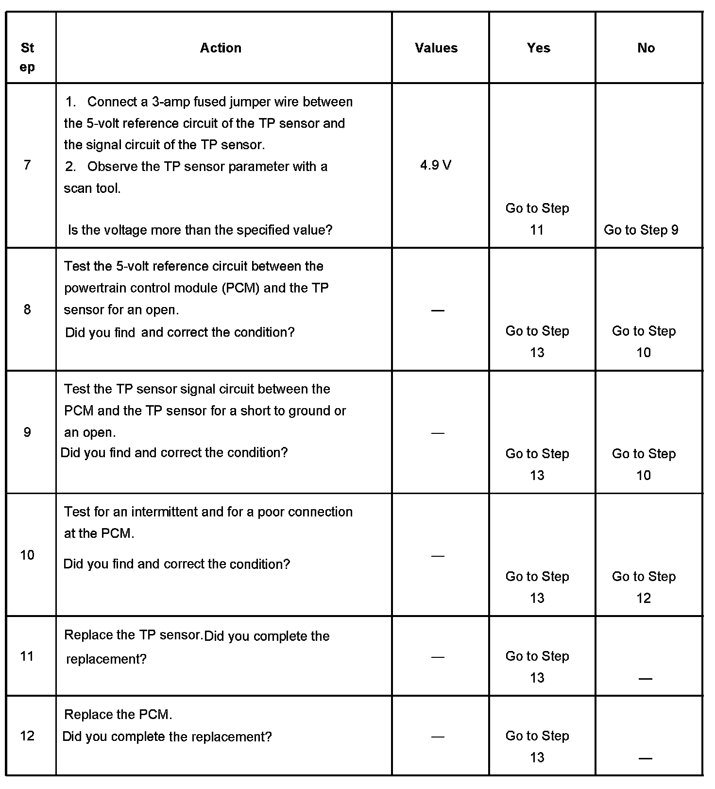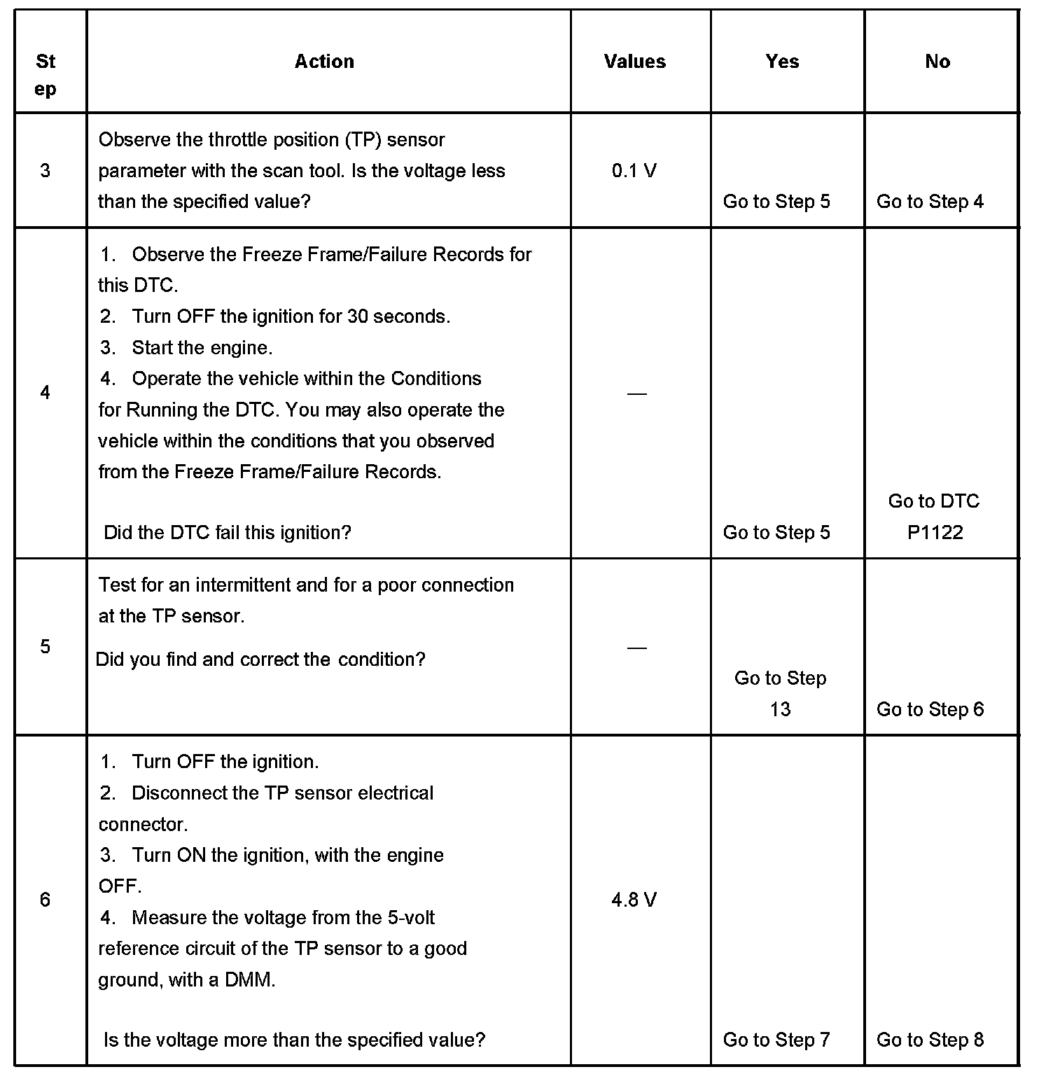 The PCM provides the TP sensor with 5 volts on the 5-volt reference circuit and a ground on the low reference circuit. Rotation of the TP sensor rotor from the closed throttle position to the wide open throttle (WOT) position provides the PCM with a signal voltage from less than 1.0 volt to more than 4.0 volts through the TP sensor signal circuit. When the conditions for running this DTC are met, the PCM will use the manifold absolute pressure (MAP) sensor to determine if the predicted operating range of the TP sensor is correct. If the PCM detects that the TP sensor voltage is out of the predicted range DTC P0122 sets.