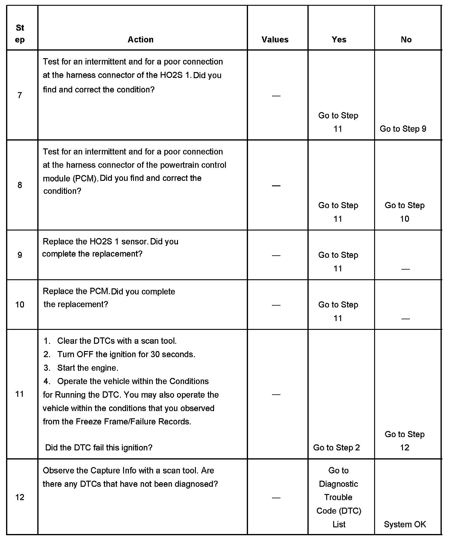 Heated oxygen sensors (HO2S) are used for fuel control and post catalyst monitoring. Each HO2S compares the oxygen content of the surrounding air with the oxygen content of the exhaust stream. When the vehicle is first started, the powertrain control module (PCM) operates in an Open Loop mode, ignoring the HO2S signal voltage when calculating the air-to-fuel ratio. The PCM supplies the HO2S with a reference or bias voltage of about 450 mV. The HO2S generates a voltage within a range of 0-1,000 mV that fluctuates above and below bias voltage once the sensor reaches operating temperature. A high HO2S voltage output indicates a rich fuel mixture. A low HO2S voltage output indicates a lean mixture. Heating elements inside the HO2S minimize the time required for the sensors to reach operating temperature, and provide an accurate voltage signal. If the PCM detects that the HO2S 1 voltage remains above a calibrated voltage for an excessive amount of time, DTC P0131 will set.