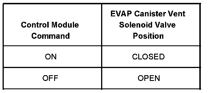 The table illustrates the relationship between the ON and OFF states, and the OPEN or CLOSED states of the EVAP canister vent solenoid valve.