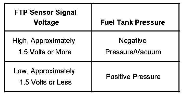 The table illustrates the relationship between the FTP sensor signal voltage and the EVAP system pressure/vacuum.