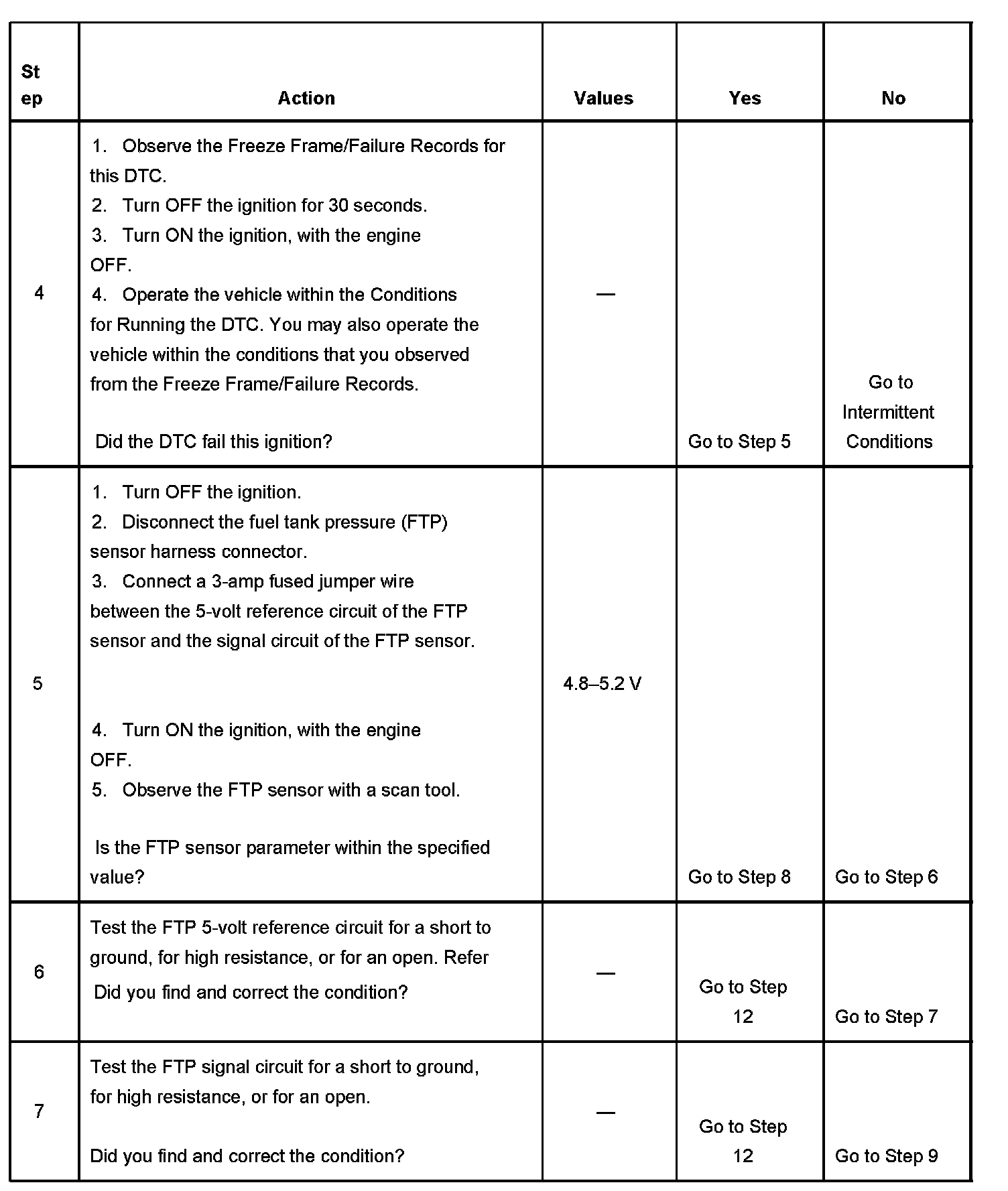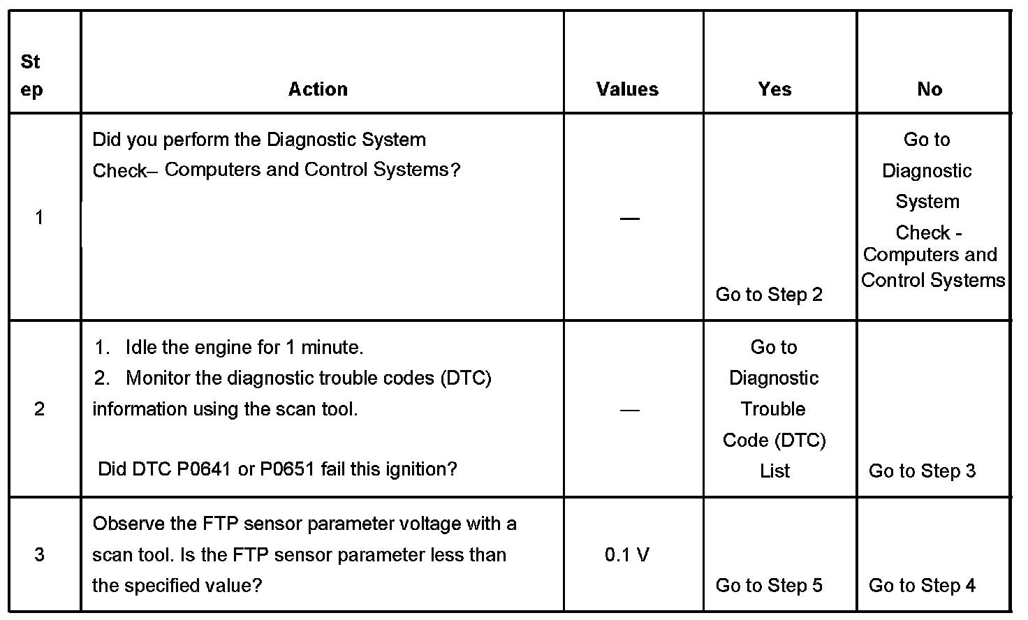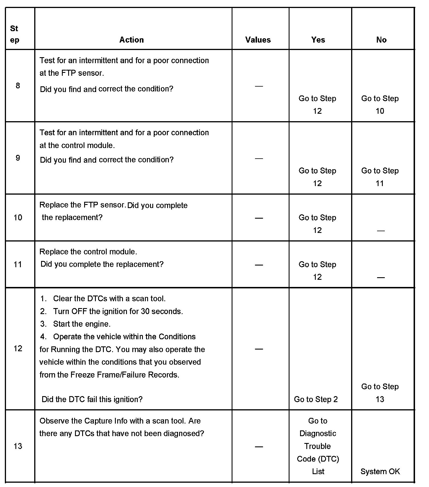 The fuel tank pressure (FTP) sensor measures the difference between the air pressure or vacuum in the evaporative emission (EVAP) system, and the outside air pressure. The control module supplies a 5-volt reference and a low reference circuit to the FTP sensor. The FTP sensor signal circuit voltage varies depending on EVAP system pressure or vacuum. If the FTP sensor signal voltage goes below a calibrated value, this DTC sets.