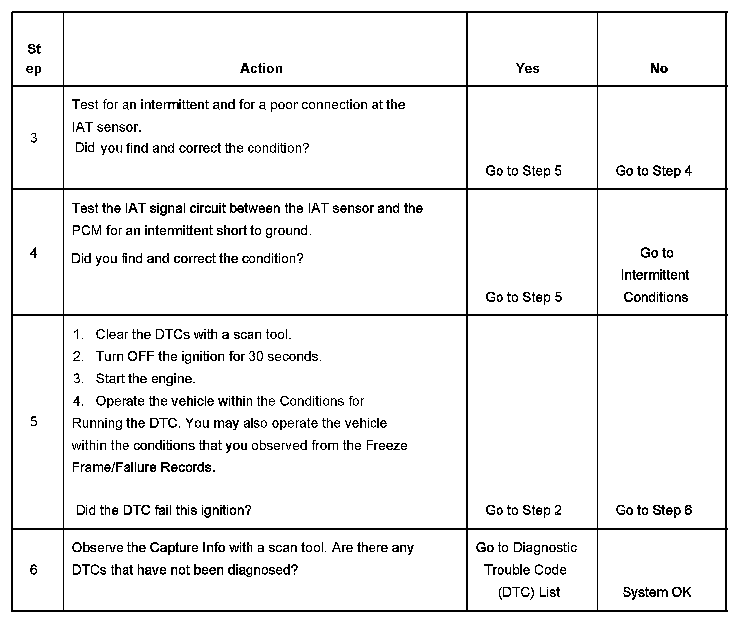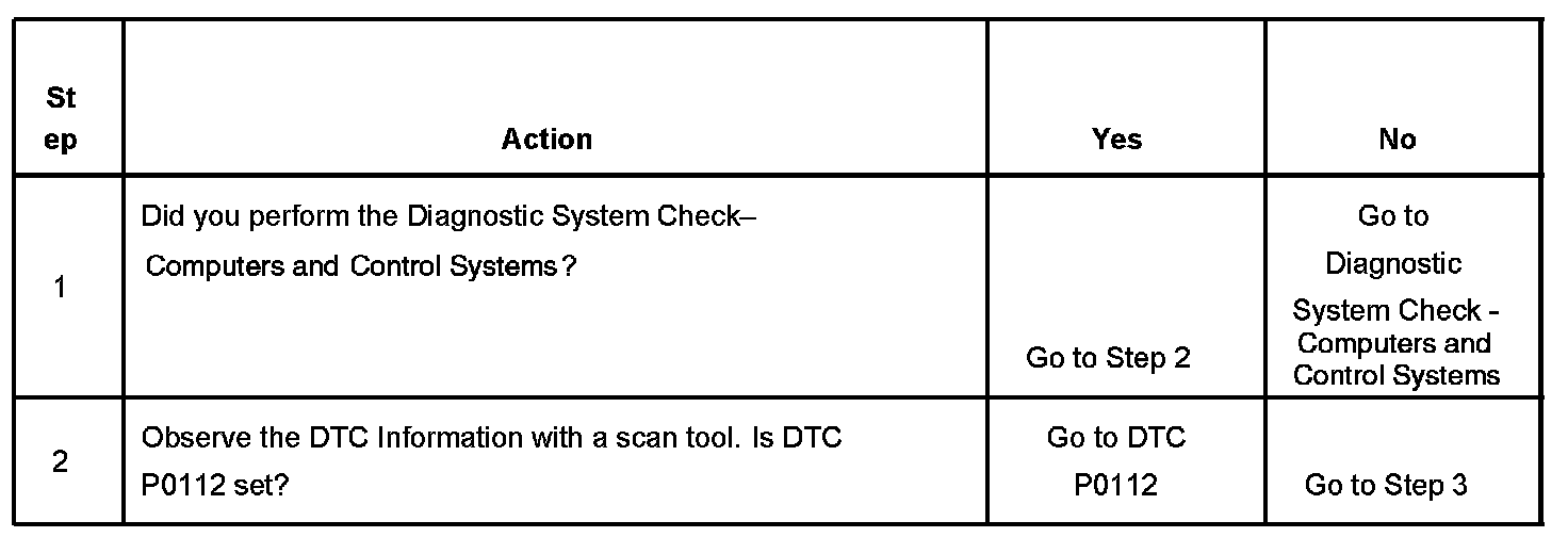 The intake air temperature (IAT) sensor is a variable resistor. The IAT sensor has a signal circuit and a low reference circuit. The IAT sensor measures the temperature of the air entering the engine. The powertrain control module (PCM) supplies 5 volts to the IAT signal circuit and a ground for the IAT low reference circuit. When the IAT sensor is cold, the sensor resistance is high. When the air temperature increases, the sensor resistance decreases. With high sensor resistance, the PCM detects a high voltage on the IAT signal circuit. With lower sensor resistance, the PCM detects a lower voltage on the IAT signal circuit. If the PCM detects an intermittent low IAT signal voltage, indicating a high temperature, DTC P1112 sets.
