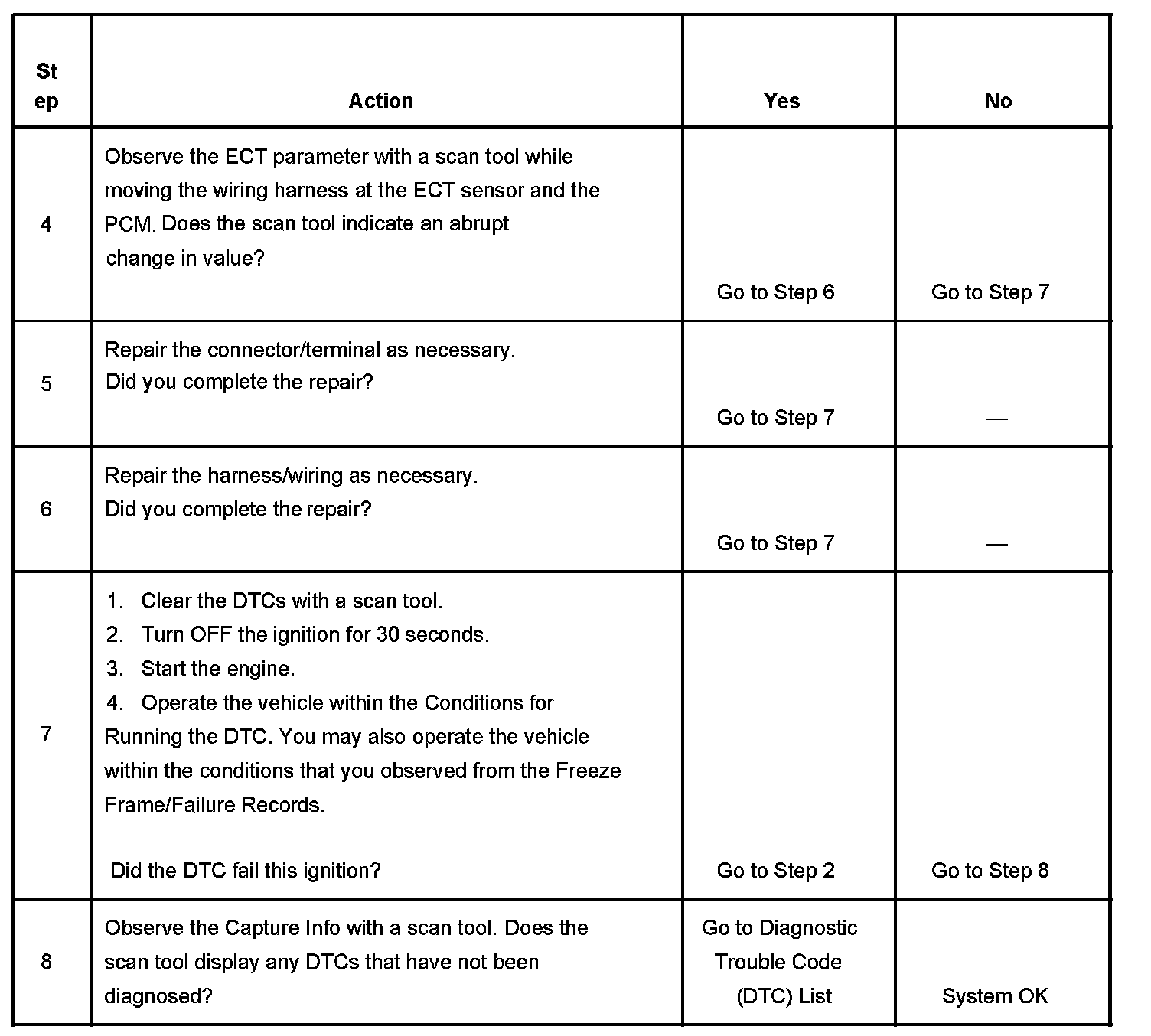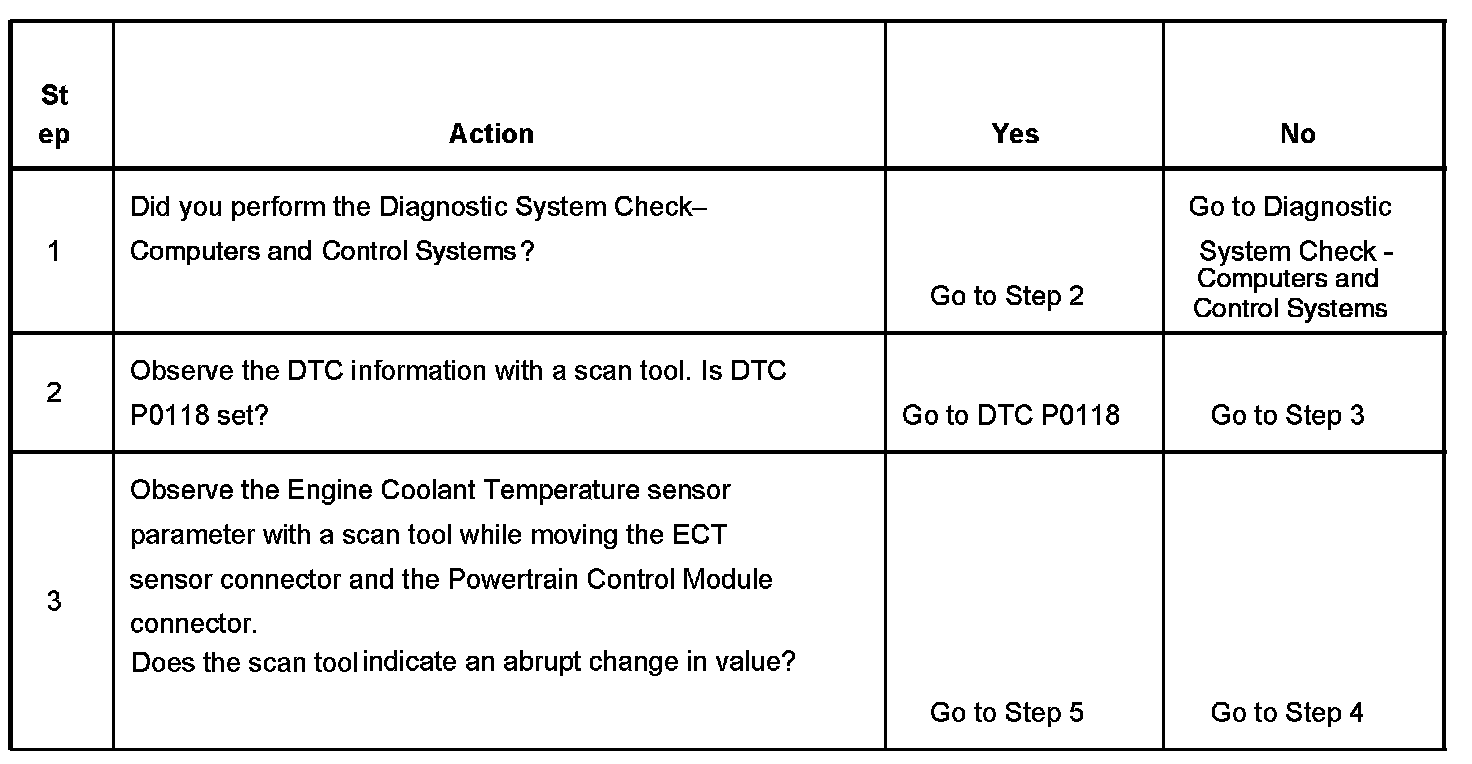 The engine coolant temperature (ECT) sensor is a variable resistor, that measures the temperature of the engine coolant. The powertrain control module (PCM) supplies 5 volts to the ECT signal circuit and a ground for the ECT low reference circuit. When the ECT is cold, the sensor resistance is high. When the ECT increases, the sensor resistance decreases. With high sensor resistance, the PCM detects a high voltage on the ECT signal circuit. With lower sensor resistance, the PCM detects a lower voltage on the ECT signal circuit. If the PCM detects an excessively high signal voltage, which is a low temperature indication, DTC P1115 sets.