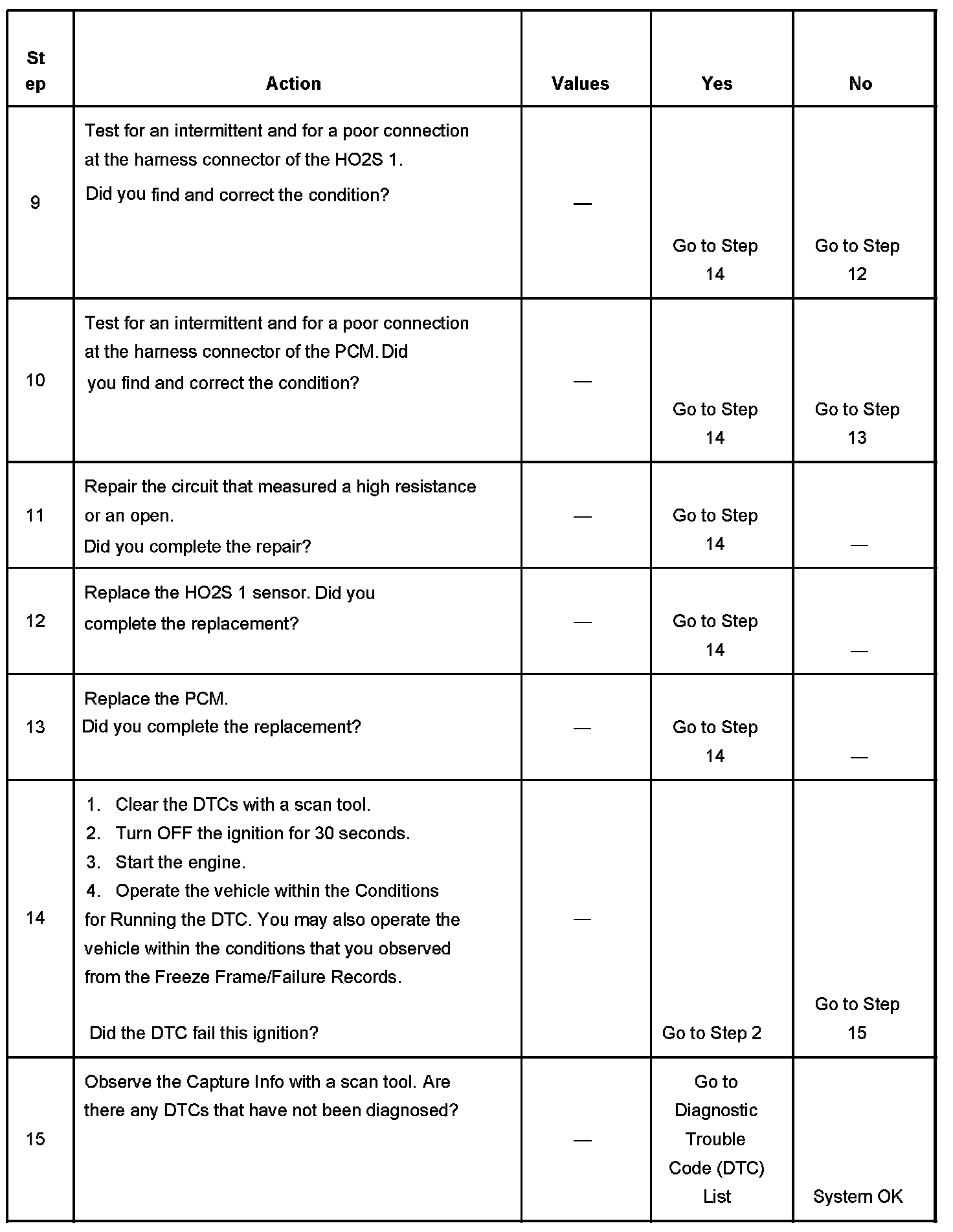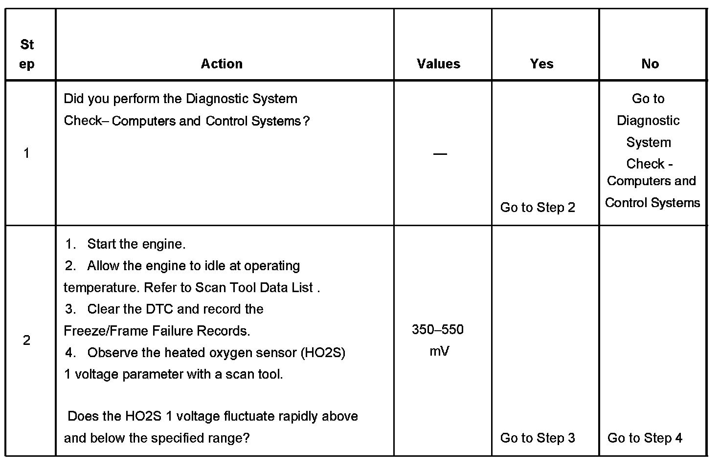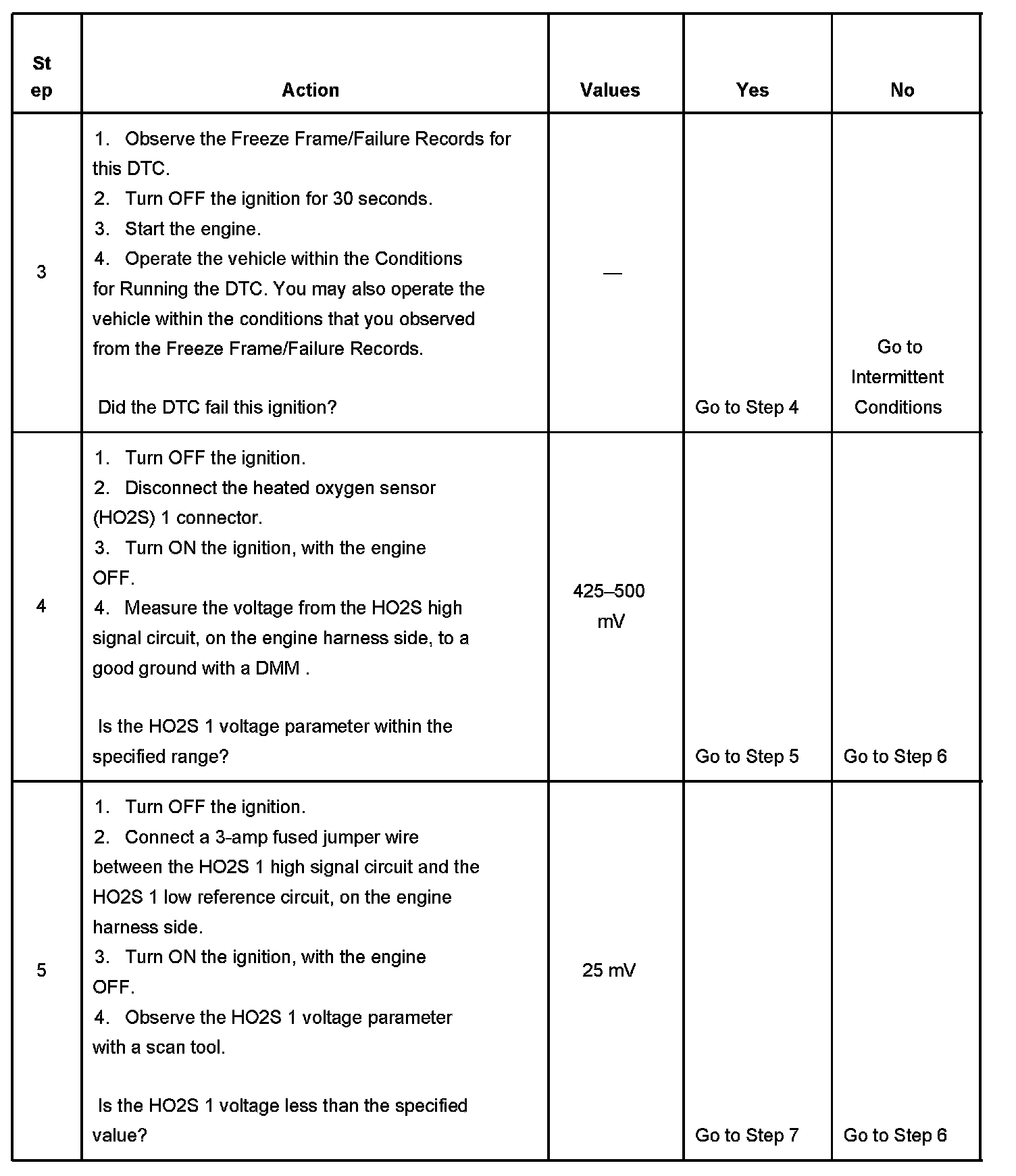 Heated oxygen sensors (HO2S) are used for fuel control and post catalyst monitoring. Each HO2S compares the oxygen content of the surrounding air with the oxygen content of the exhaust stream.When the vehicle is first started, the powertrain control module (PCM) operates in an Open Loop mode, ignoring the HO2S signal voltage when calculating the air-to-fuel ratio. The PCM supplies the HO2S with a reference, or bias, voltage of about 450 mV. The HO2S generates a voltage within a range of 0-1,000 mV that fluctuates above and below bias voltage once in Closed Loop. A high HO2S voltage output indicates a rich fuel mixture. A low HO2S voltage output indicates a lean mixture. Heating elements inside the HO2S minimize the time required for the sensors to reach operating temperature, and to provide an accurate voltage signal. If the PCM detects that the HO2S 1 voltage did not switch above 598 mV and below 299 mV enough times during a calibrated time period, DTC P1133 will set.