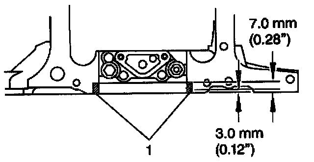 1. Apply sealant GM P/N 12345739 (Canadian P/N 10953541) at the rear main bearing cap and the engine block (1).