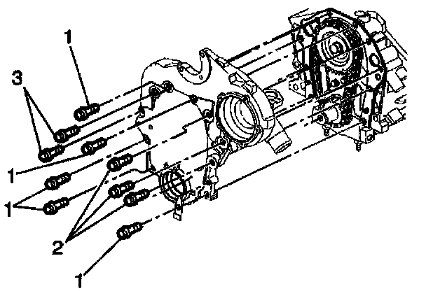 3. Remove the engine front cover bolts (1), (2), and (3).