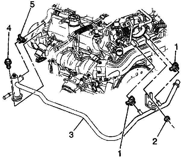 4. Install the thermostat bypass pipe (3) and hose clamp (5)