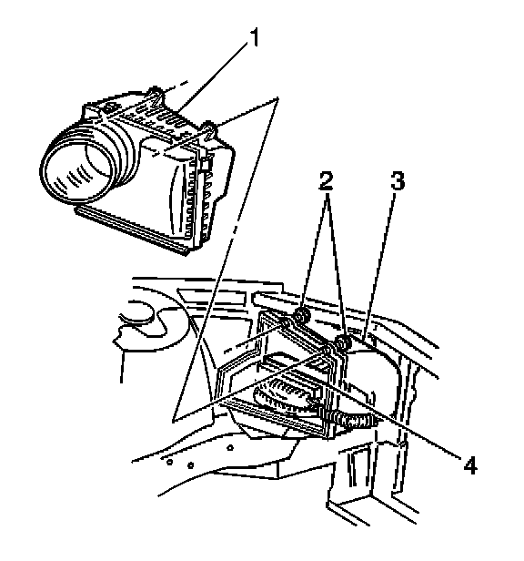 6. Remove the air cleaner housing (1) by pulling the housing from the 2 rubber grommets (2) in the engine compartment.