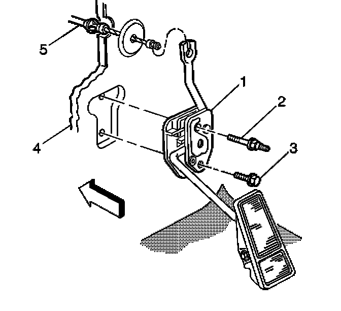 3. Remove the accelerator pedal bolt (2) and the stud (3).