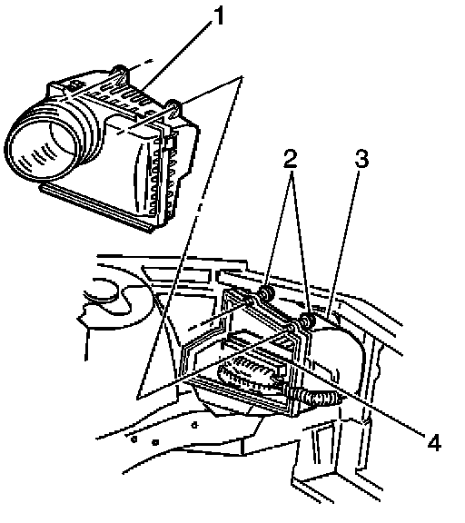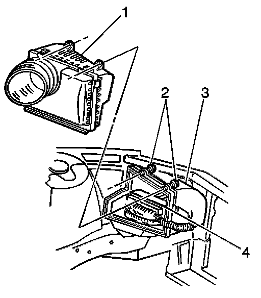 3. Without disconnecting the PCM connectors, remove the PCM (4) and the harness from the air cleaner housing.