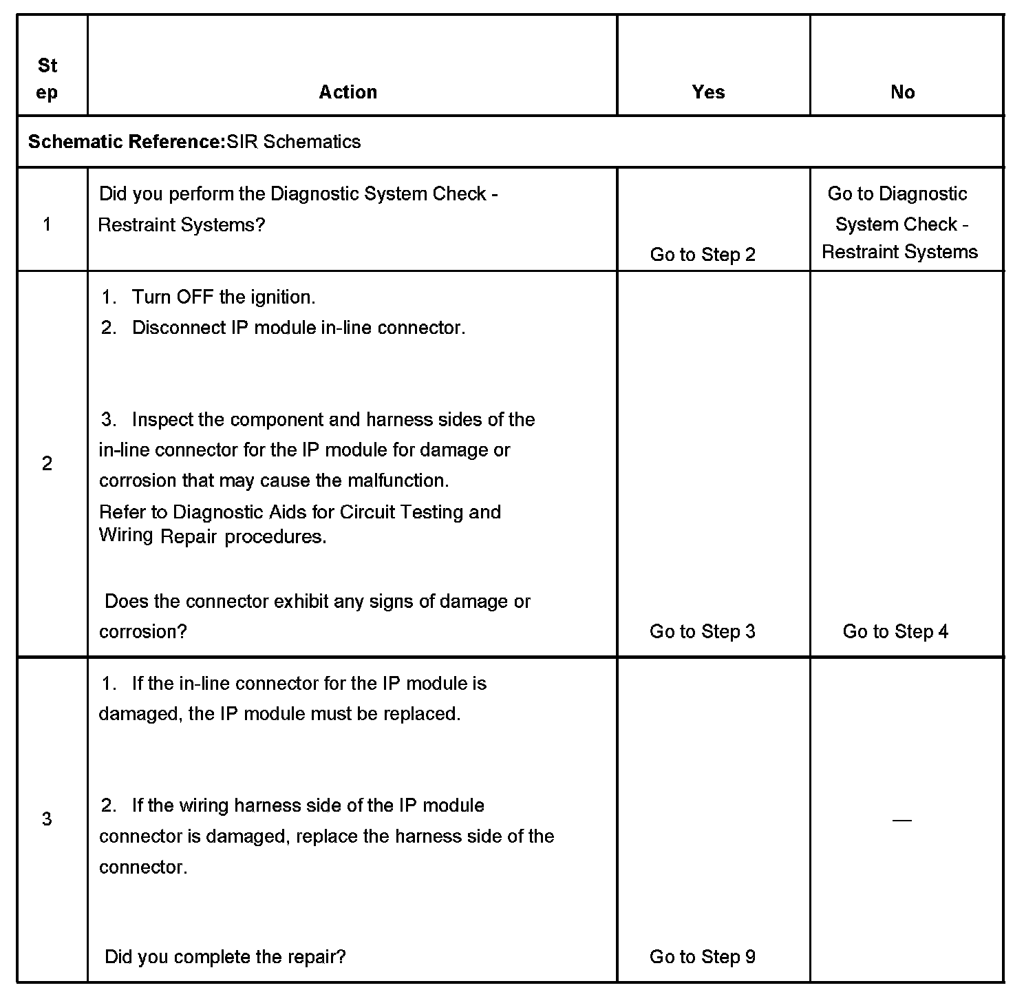 CIRCUIT DESCRIPTIONThe dual stage inflatable restraint IP module deployment loop consists of the dual stage inflatable restraint IP module, and the IP module high and low circuits for both stages 1 and 2. Two shorting bars used within the IP module connector short together both the IP module stage 1 high and low circuits, and the IP module stage 2 high and low circuits when the connector is disconnected. This helps to prevent unwanted deployment of the inflator module during servicing. During a frontal crash of sufficient force the inflatable restraint sensing and diagnostic module (SDM) allows current to flow through the deployment loop in order to deploy the IP module. When the ignition is turned ON, the SDM performs continuous diagnostic tests on the deployment loops to check for proper circuit continuity and for shorts to ground or voltage. If a malfunction is detected, a diagnostic trouble code (DTC) will be stored in memory.