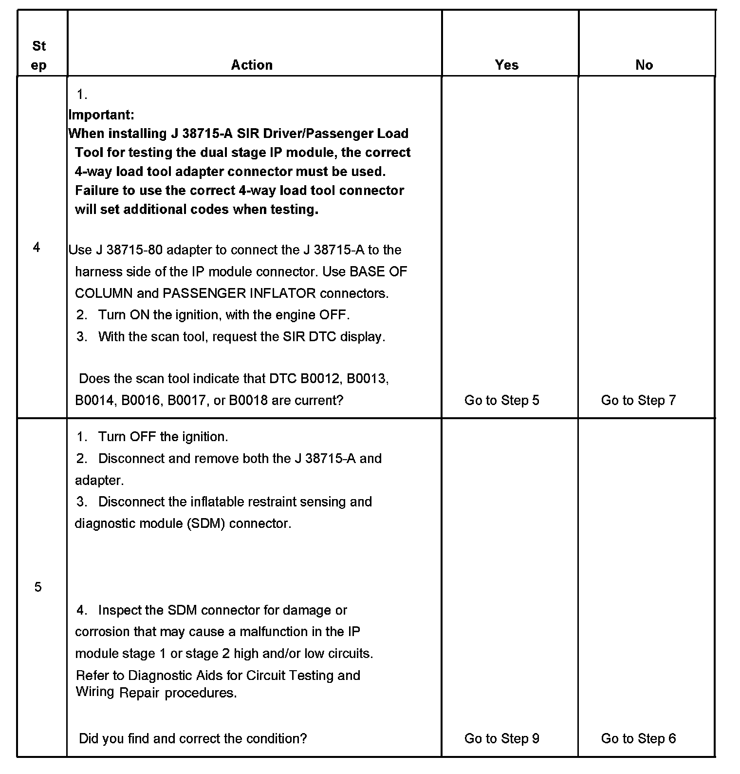 6. Tests to see what DTCs are present. If DTC B0012 or B0016 is present, test the IP module for a short between high and low circuits in stage 1 or stage 2. If DTC B0013 or B0017 is present, test the IP module high and low circuits for an open and for high resistance in stage 1 or stage 2. If DTC B0014 or B0018 is present, test the IP module high and low circuits for a short to ground and for a short to voltage in stage 1 or stage 2.