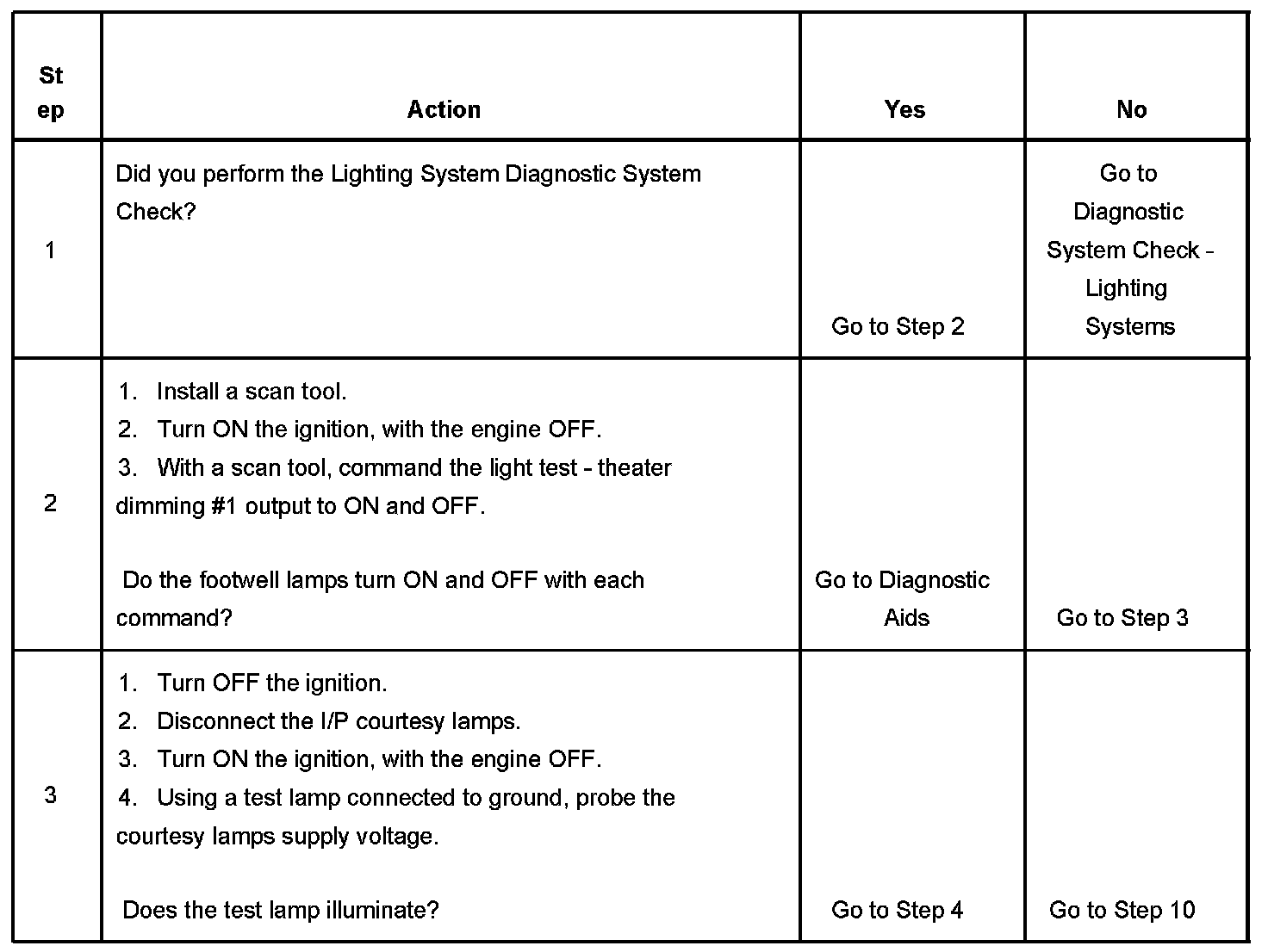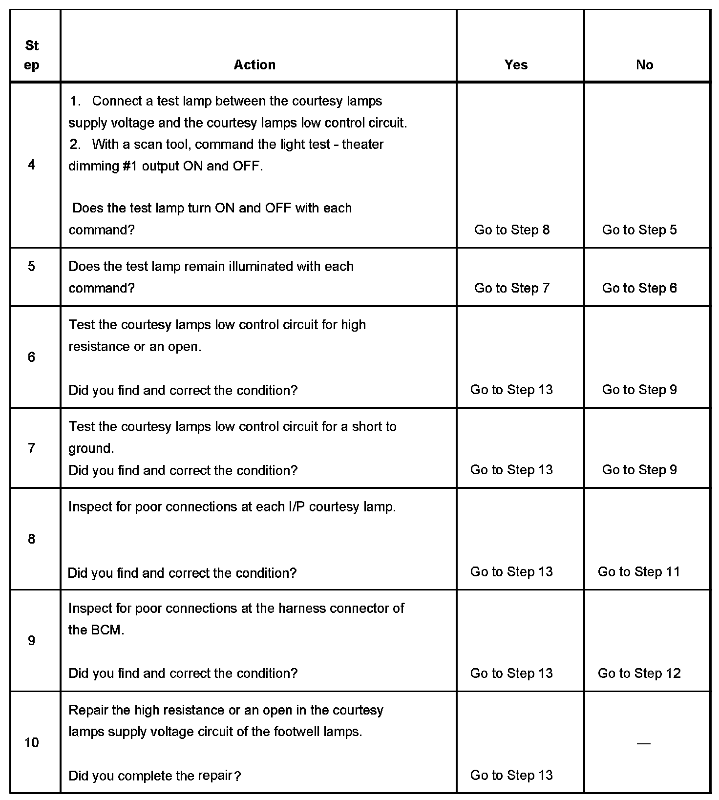 - The BCM detects that the output for the courtesy lamps supply voltage circuit is low when it is expected to be high.