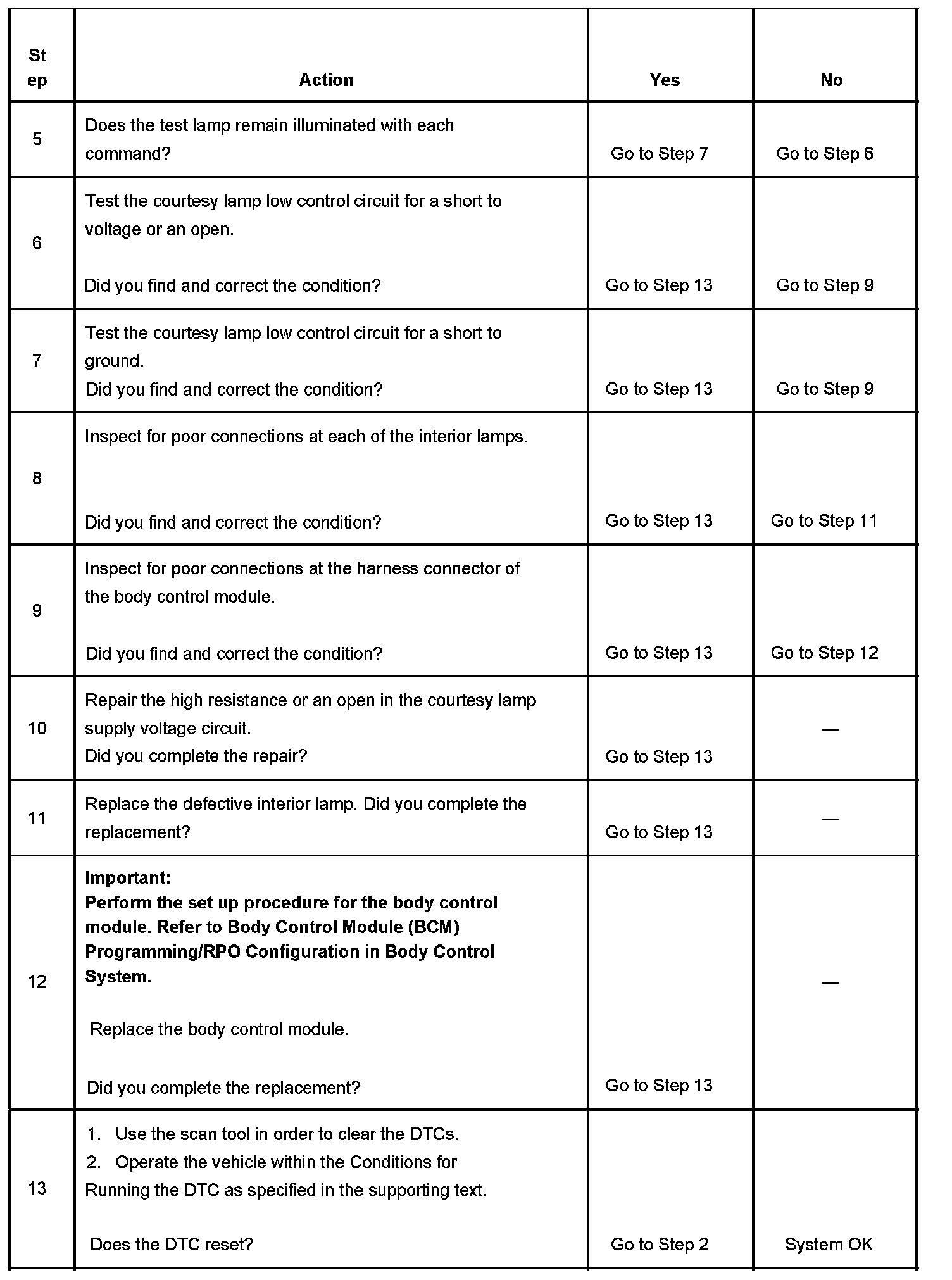 - The BCM detects an output that is low when a high is expected in the courtesy lamp low control circuit.