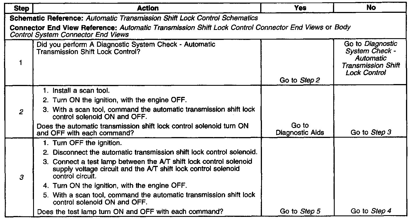 3. Tests for an internal short of the automatic transmission shift lock control solenoid. Command both ON and OFF states. Repeat the commands as necessary.