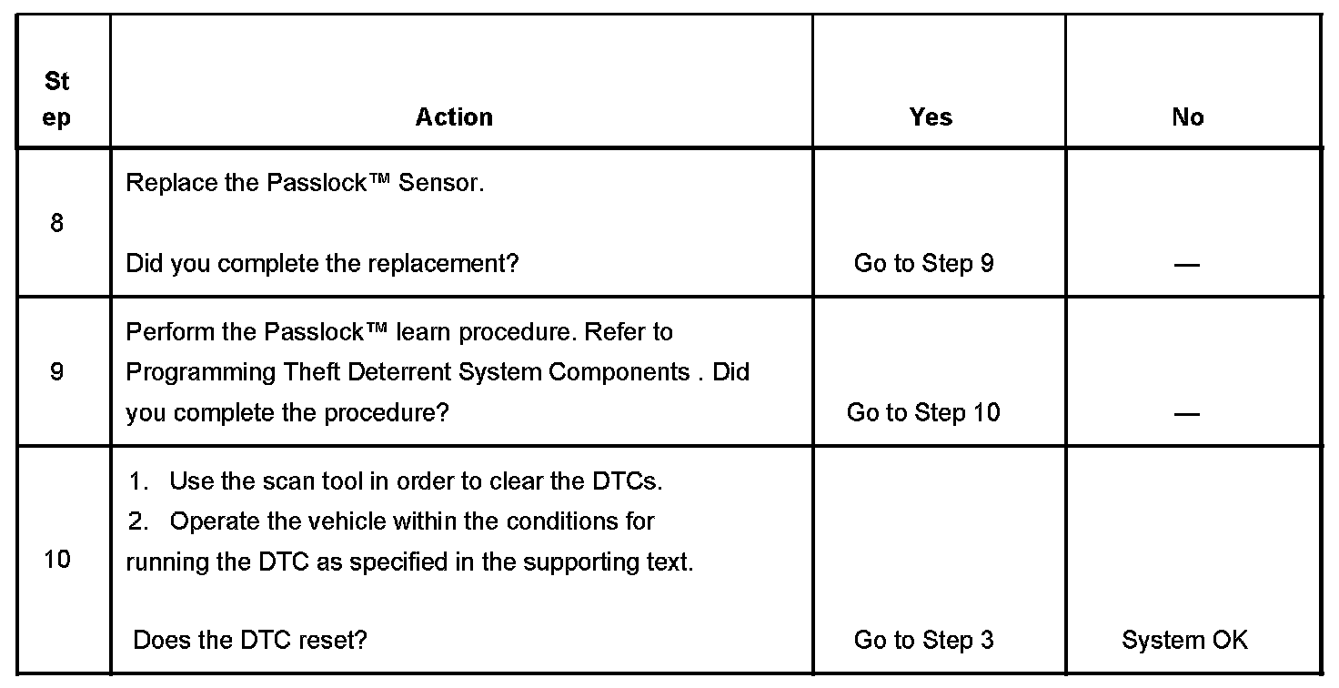 - When a short to ground is no longer present on the Passlock sensor power circuit, the ignition switch must be cycled from OFF to ON before this DTC can change from a current DTC to a history DTC.