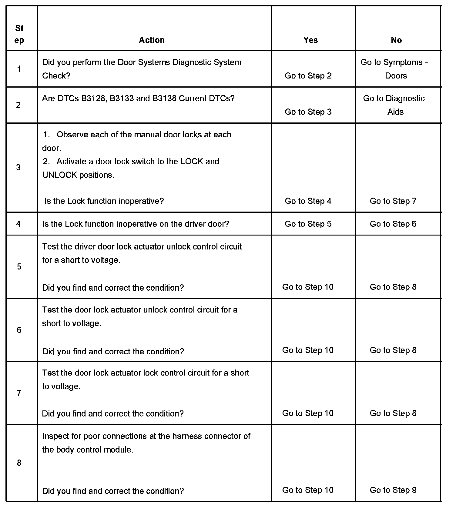 - A current DTC B3128, B3133 or B3138 is cleared when the BCM no longer detects a short to voltage on the door lock actuator lock control circuit, door lock actuator unlock control circuit or driver door lock actuator unlock control circuit for greater than 150 milliseconds