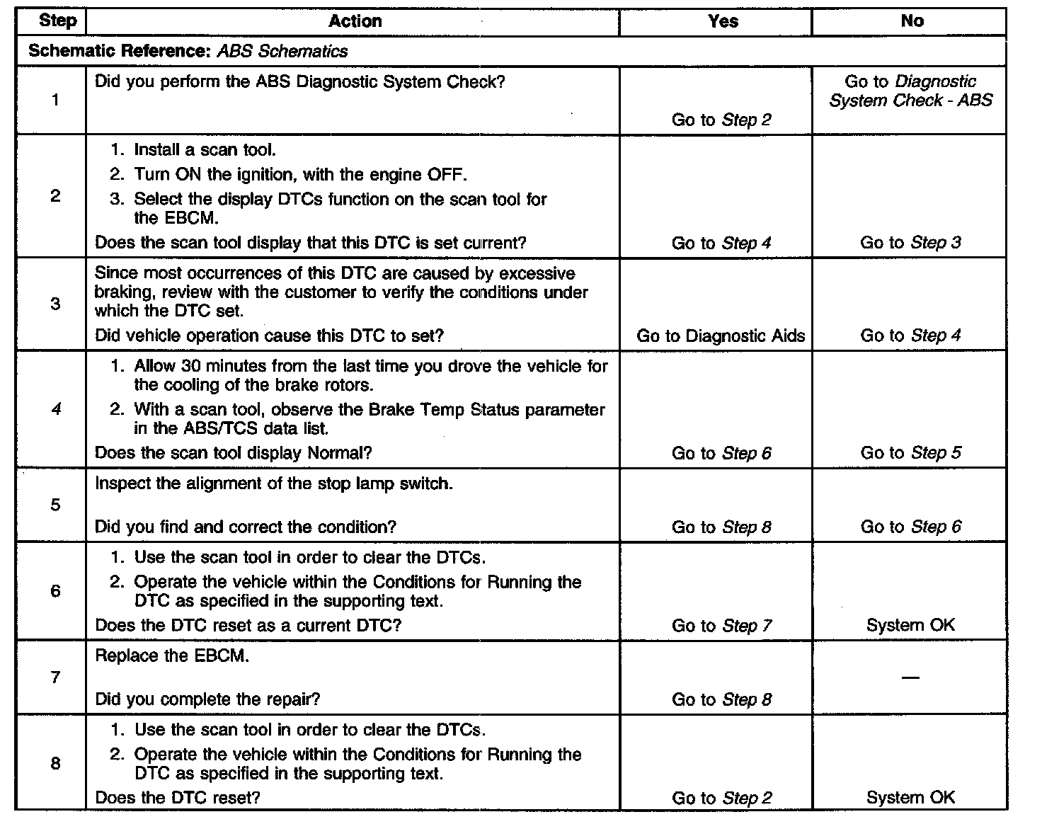 This DTC sets when the estimated brake rotor temperature of either of the drive wheels exceeds 375°C (700°F). When the estimated brake rotor temperature of either of the drive wheels exceeds 375°C (700°F) during normal braking or normal ABS operations, the DTC does not set until the next TCS activation. The brake rotor temperature can exceed 375°C (700°F) without setting the DTC if a TCS activation has not occurred. When the estimated brake rotor temperature of either of the drive wheels exceeds 375°C (700°F) during a TCS activation, the DTC sets immediately, but the EBCM does not disable TCS until the end of the TCS event.