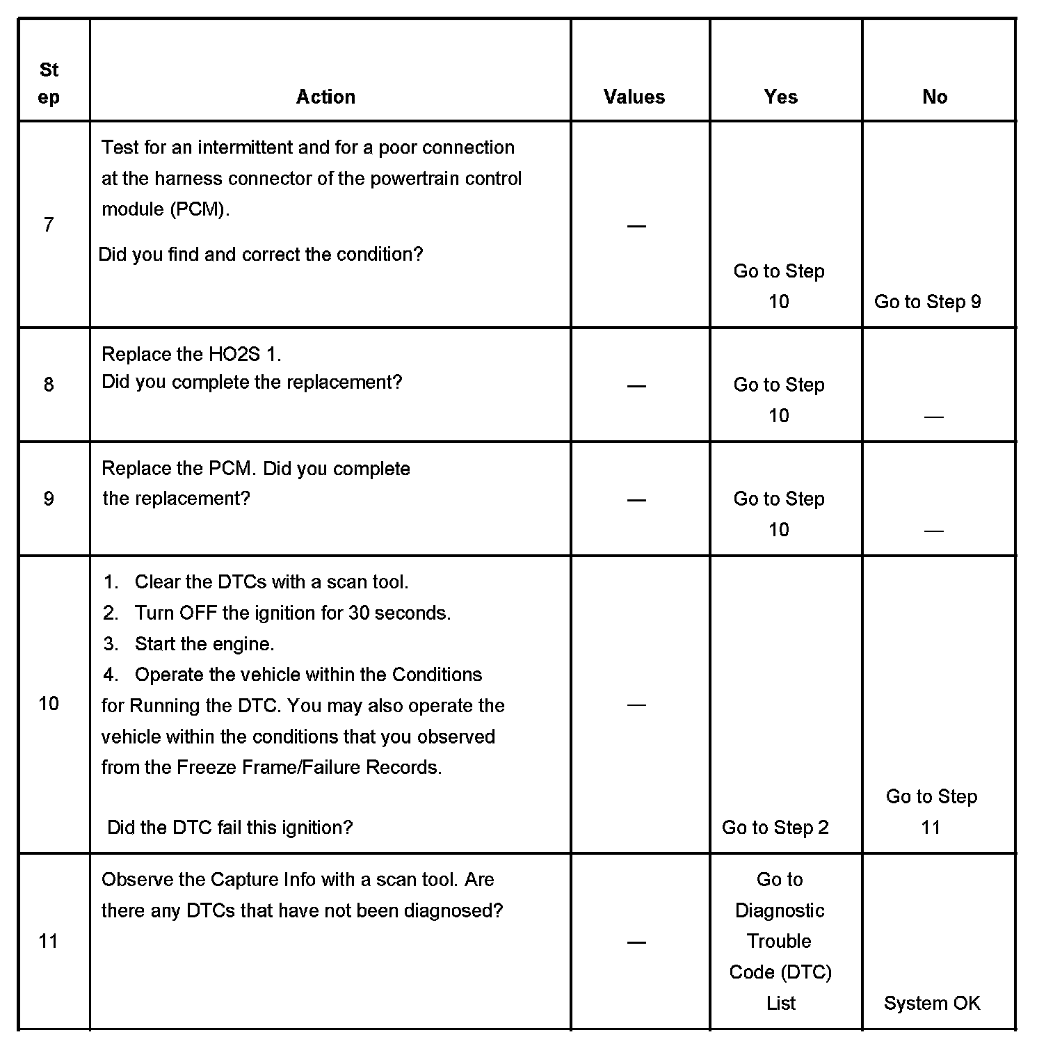 Heated oxygen sensors (HO2S) are used for fuel control and post catalyst monitoring. Each HO2S compares the oxygen content of the surrounding air with the oxygen content of the exhaust stream.When the vehicle is first started, the powertrain control module (PCM) operates in an Open Loop mode, ignoring the HO2S signal voltage when calculating the air-to-fuel ratio. The PCM supplies the HO2S with a reference, or bias, voltage of about 450 mV. The HO2S generates a voltage within a range of 0- 1,000 mV that fluctuates above and below bias voltage once the sensor reaches operating temperature. A high HO2S voltage output indicates a rich fuel mixture. A low HO2S voltage output indicates a lean mixture. Heating elements inside the HO2S minimize the time required for the sensors to reach operating temperature, and then provide an accurate voltage signal. The PCM controls the HO2S 1 heater low control circuit with a low side driver. The HO2S 1 heater diagnostic monitors the circuit status through the HO2S 1 low side driver when the engine is running. If the PCM detects that there is a circuit fault present on the HO2S 1 heater low control circuit, DTC P0030 will set.