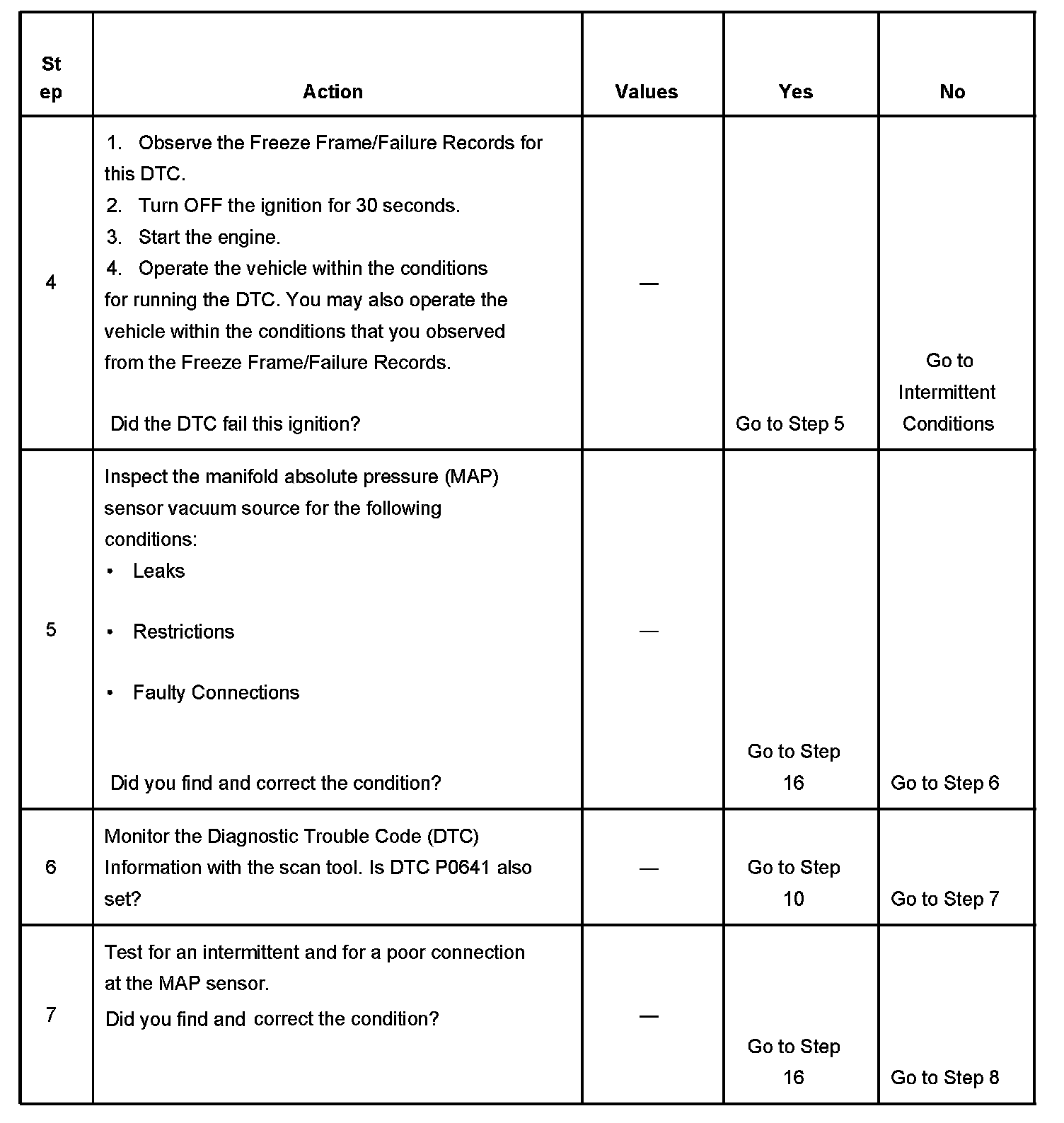 The PCM detects that the MAP sensor signal voltage is more than 4.2 volts for 7 seconds.