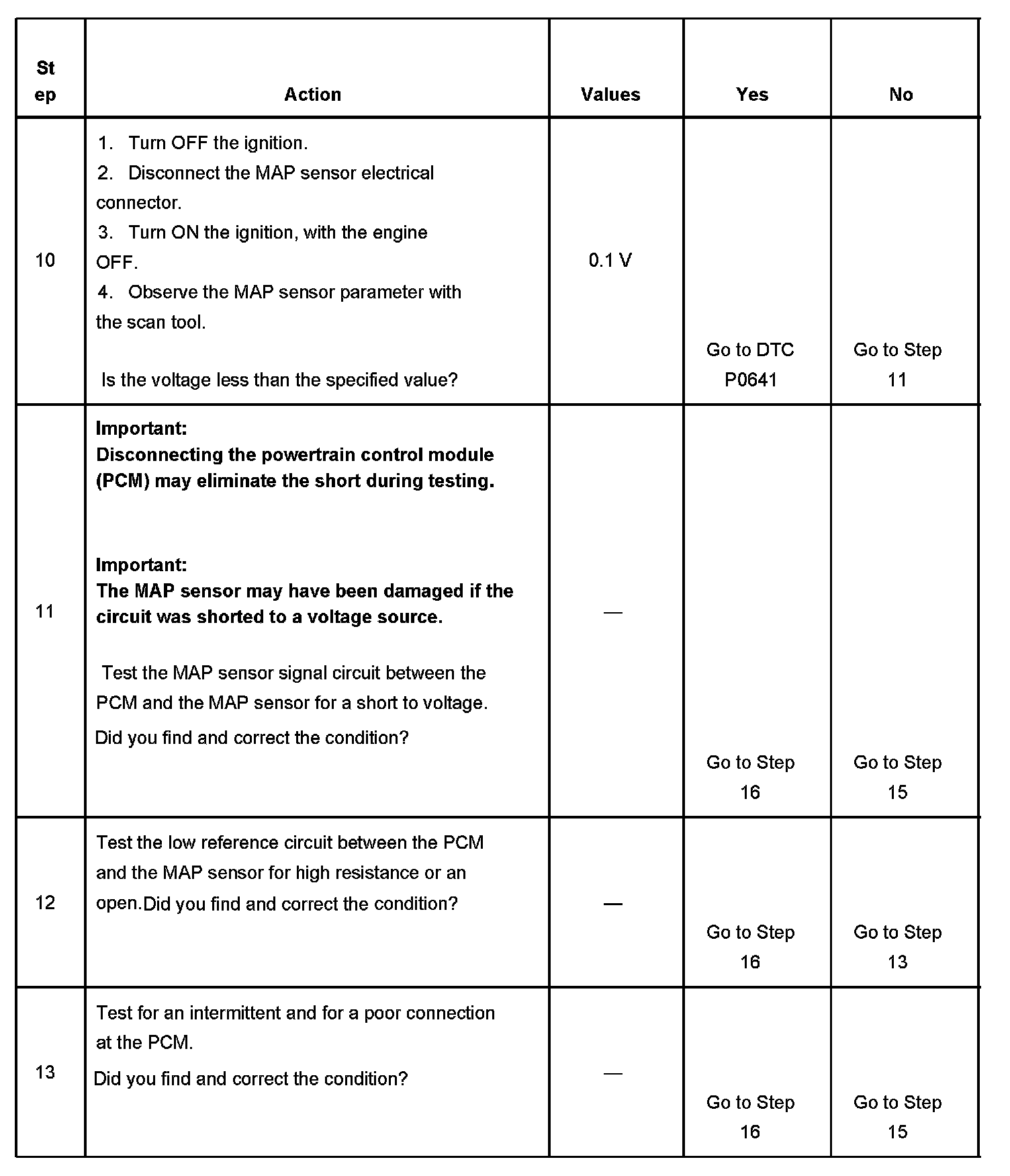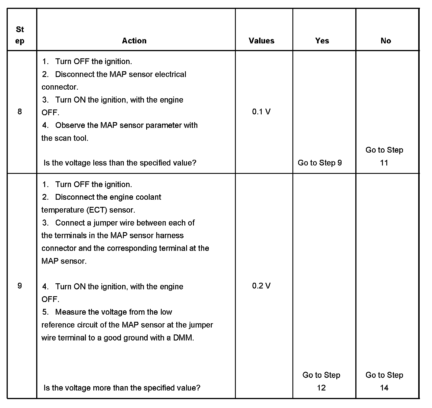 The MAP sensor responds to changes in intake manifold pressure which gives an indication of the engine load. The MAP sensor has a 5-volt reference circuit, a low reference circuit, and a signal circuit.The PCM supplies 5 volts to the MAP sensor on the 5-volt reference circuit, and provides a ground on the low reference circuit. The MAP sensor provides a signal to the PCM on the MAP sensor signal circuit, which is relative to the pressure changes in the manifold. With low MAP, such as during idle or deceleration, the PCM should detect a low MAP sensor signal voltage. With high MAP, such as WOT, the PCM should detect a high MAP sensor signal voltage. This MAP sensor will indicate pressure between 8-208 kPa. The MAP sensor is also used in order to calculate the BARO when the ignition switch is turned ON, with the engine OFF. The PCM monitors the MAP sensor signal for voltage outside of the normal range. If the PCM detects a MAP sensor signal voltage that is excessively high, DTC P0108 sets.
