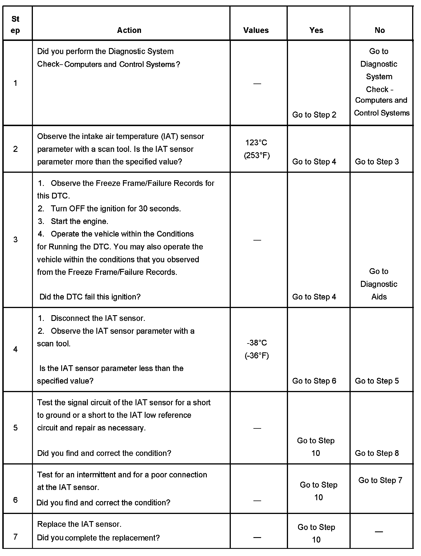 The PCM detects that the IAT sensor parameter is more than 123°C (253°F) for more than 20 seconds.
