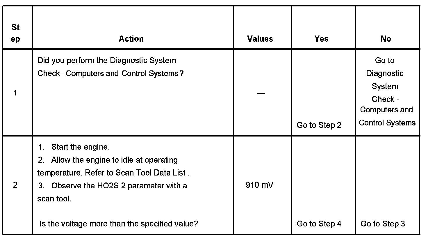 The PCM detects that the HO2S 2 voltage is more than 910 mV, for more than 2 minutes during Closed Loop operation.