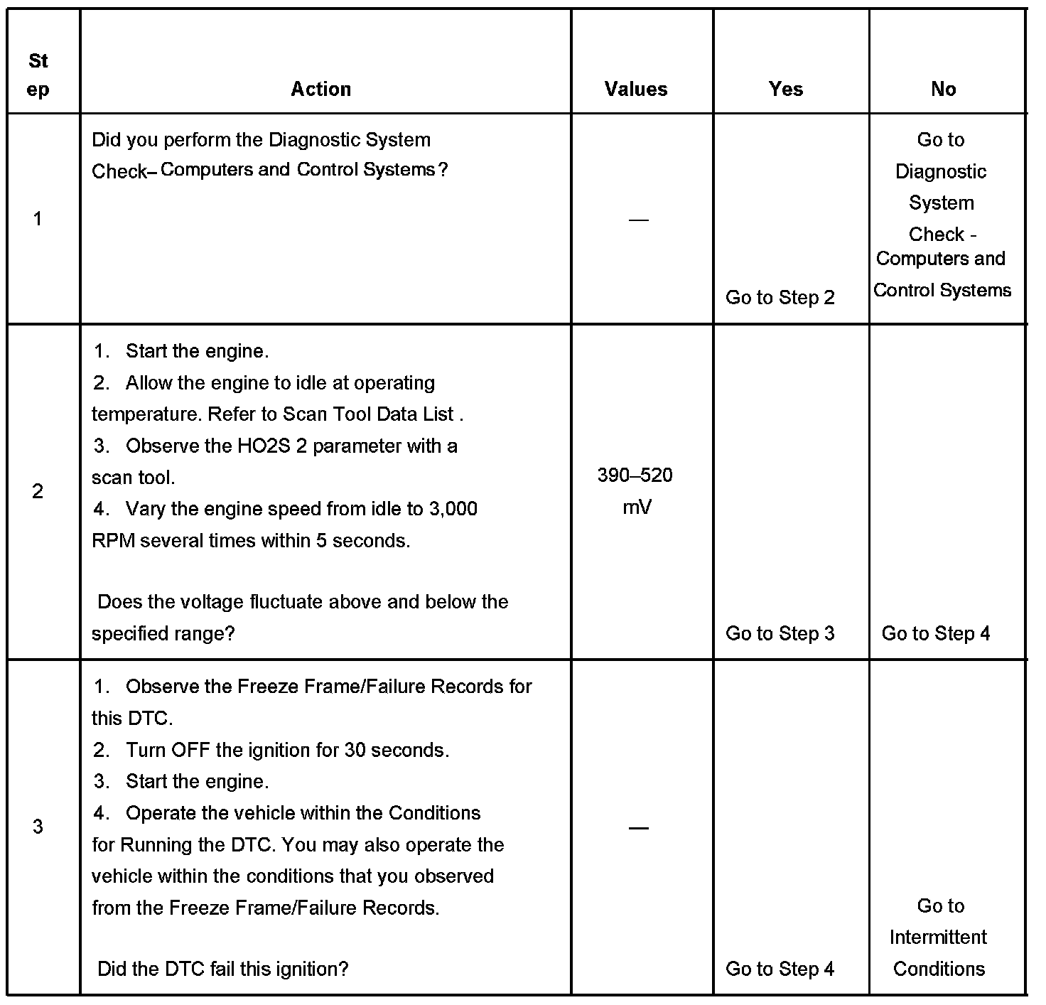 The PCM detects that the HO2S 2 voltage has not moved above or below bias voltage by more than 74 mV within a calibrated amount of time.