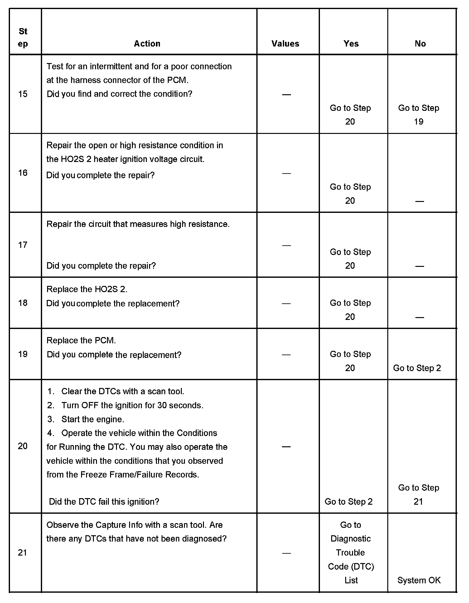- DTCs P0036, P0101, P0102, P0103, P0107, P0108, P0112, P0113, P0117, P0118, P0121, P0122, P0123, P0137, P0138, P0140, P0201, P0202, P0203, P0204, P0205, P0206, P0442, P0443, P0446, P0449, P0455, P0496 are not set.