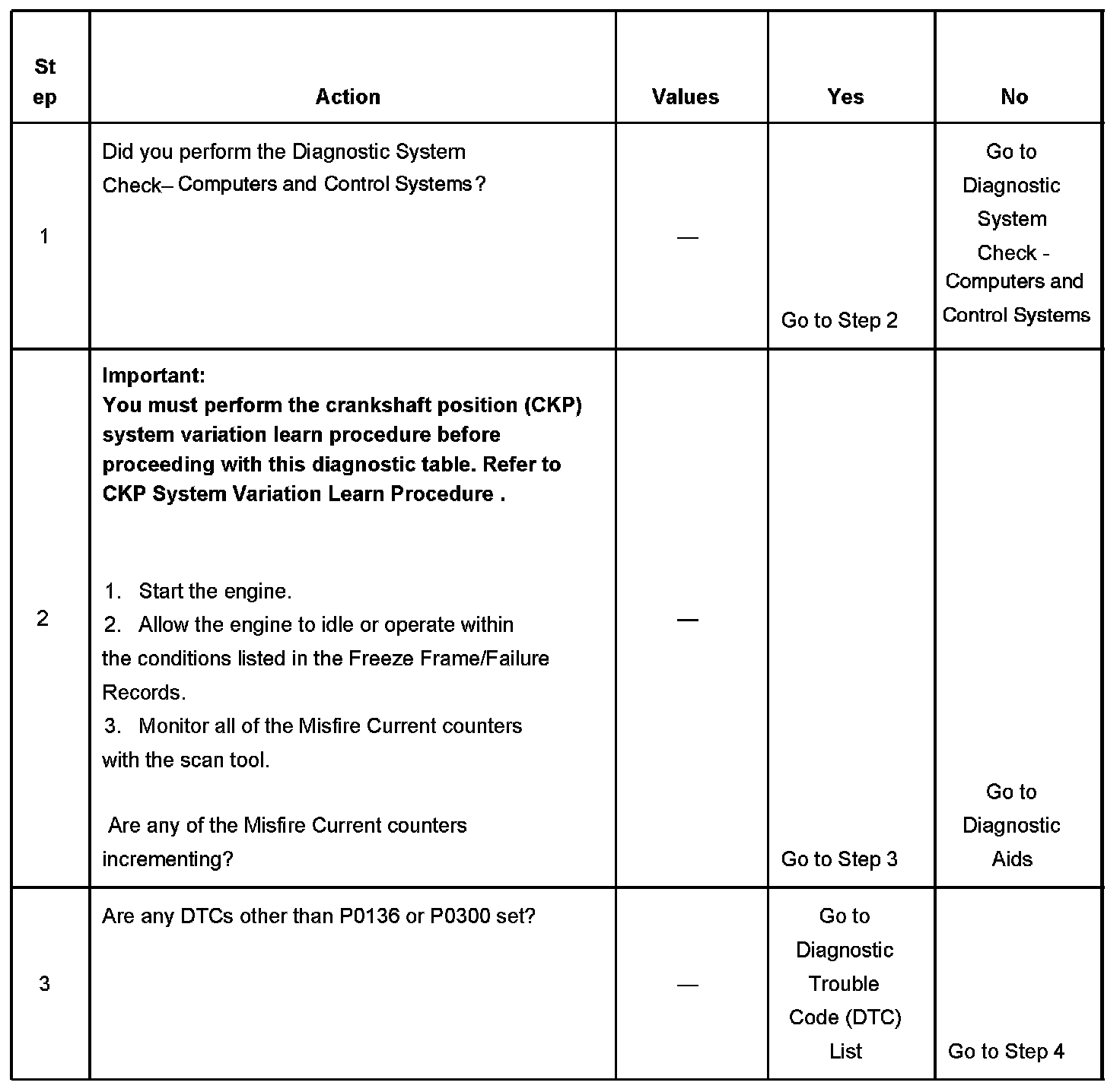The powertrain control module (PCM) uses information from the ignition control (IC) module and the camshaft position (CMP) sensor in order to determine when an engine misfire is occurring. By monitoring variations in the crankshaft rotation speed for each cylinder, the PCM is able to detect individual misfire events. A misfire rate that is high enough can cause the 3-way catalytic converter (TWC) to overheat under certain driving conditions. The malfunction indicator lamp (MIL) will flash ON and OFF when the conditions for TWC overheating are present. If the PCM detects a misfire rate sufficient to cause emission levels to exceed mandated standards, DTC P0300 will set.
