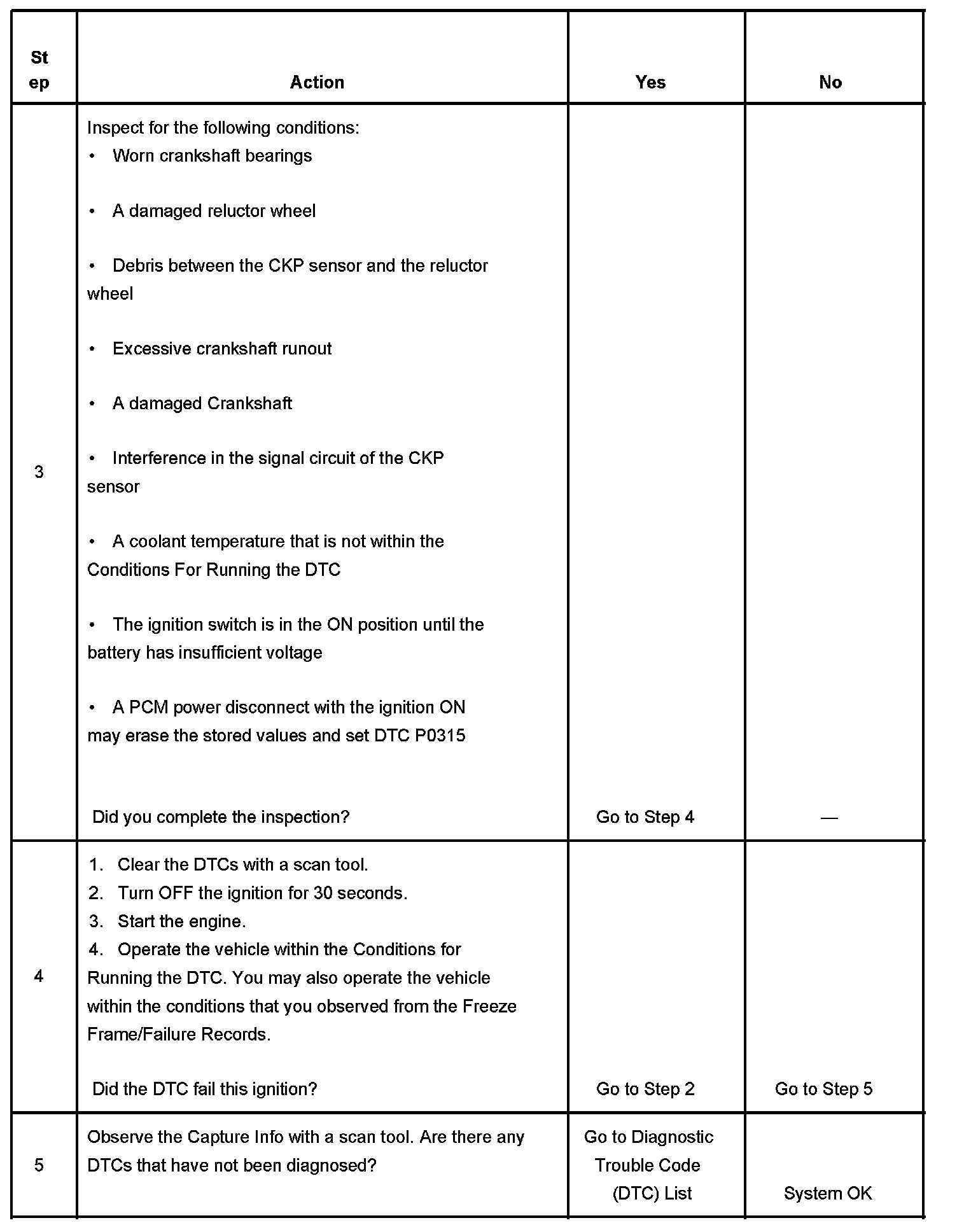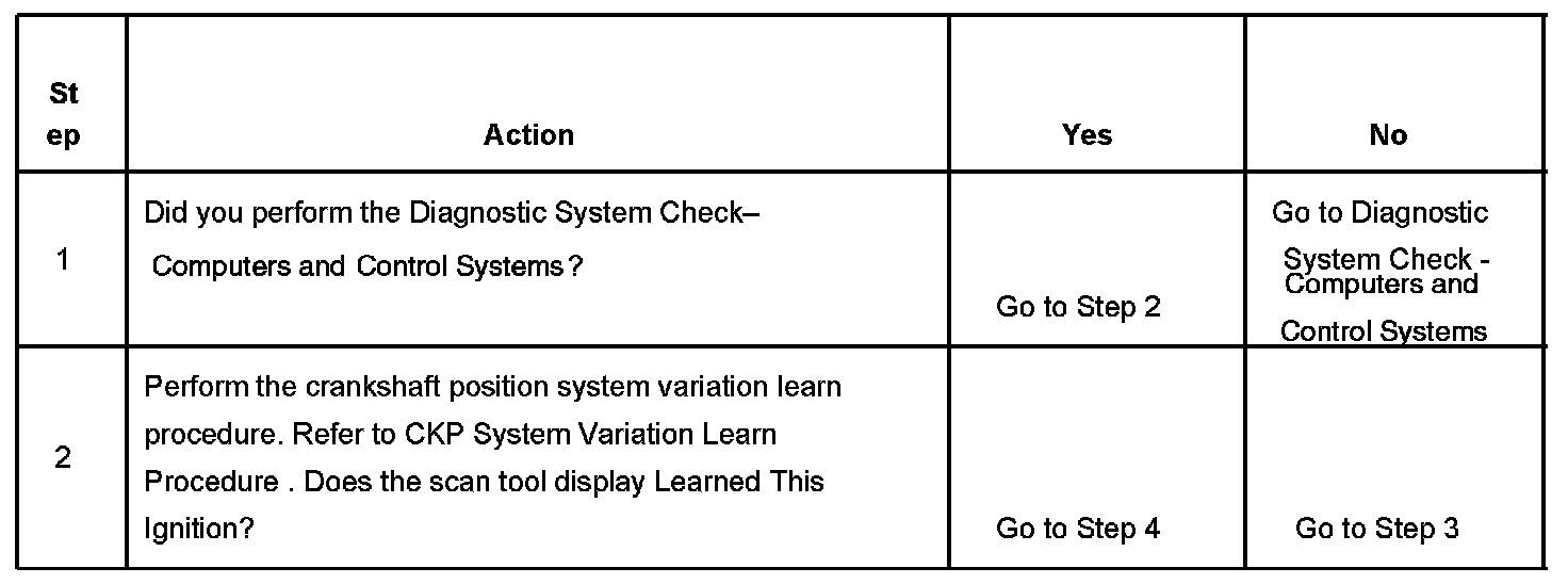 The crankshaft position (CKP) system variation learn feature is used to calculate reference period errors caused by slight tolerance variations in the crankshaft and the crankshaft position sensor. The calculated error allows the powertrain control module (PCM) to accurately compensate for reference period variations. This enhances the ability of the PCM to detect misfire events over a wider range of engine speed and load.The PCM stores the CKP system variation values after a learn procedure has been performed. If the actual CKP variation is not within the CKP system variation compensating valves stored in the PCM,DTC P0300 may set. If the CKP system variation values are not stored in the PCM memory, DTC P0315 sets.