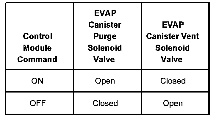 The table illustrates the relationship between the ON and OFF states, and the Open or Closed states of the EVAP canister purge and vent solenoid valves.