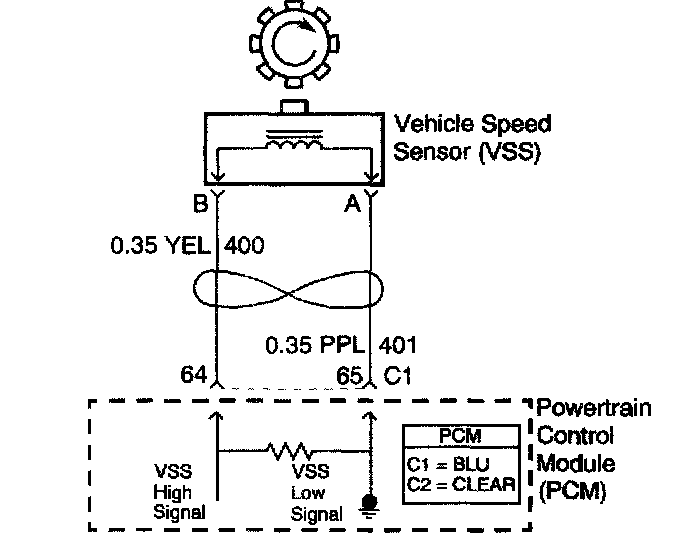 The Vehicle Speed Sensor (VSS) system is a pulse generator consisting of a speed sensor assembly, located in the case extension, and a toothed vehicle speed sensor reluctor wheel, which is pressed onto the final drive carrier assembly. As the vehicle drives forward, the vehicle speed sensor reluctor wheel rotates. This rotation produces a variable AC signal in the pickup coil that is proportional to vehicle speed. The PCM uses this signal in order to calculate vehicle speed, shift timing and gear ratios.
