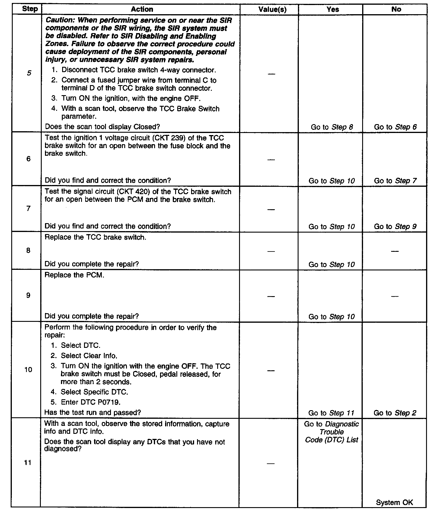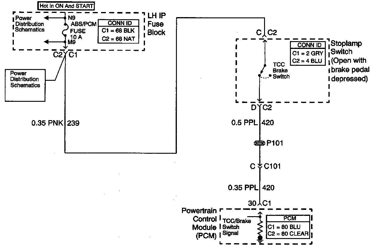 The TCC brake switch indicates brake pedal status to the PCM. The TCC brake switch indicates that the brake pedal is either applied or released. The normally-closed switch supplies battery voltage to the. PCM. Applying the brake pedal opens the TCC brake switch, interrupting voltage to the PCM. When the PCM receives 0 volts at the TCC brake switch input, the PCM turns OFF the torque converter clutch pulse width modulation (TCC PWM) solenoid valve. If the PCM detects an open brake switch, indicating pedal applied during a number of accelerations, then DTC P0719 sets. DTC P0719is a type C DTC.