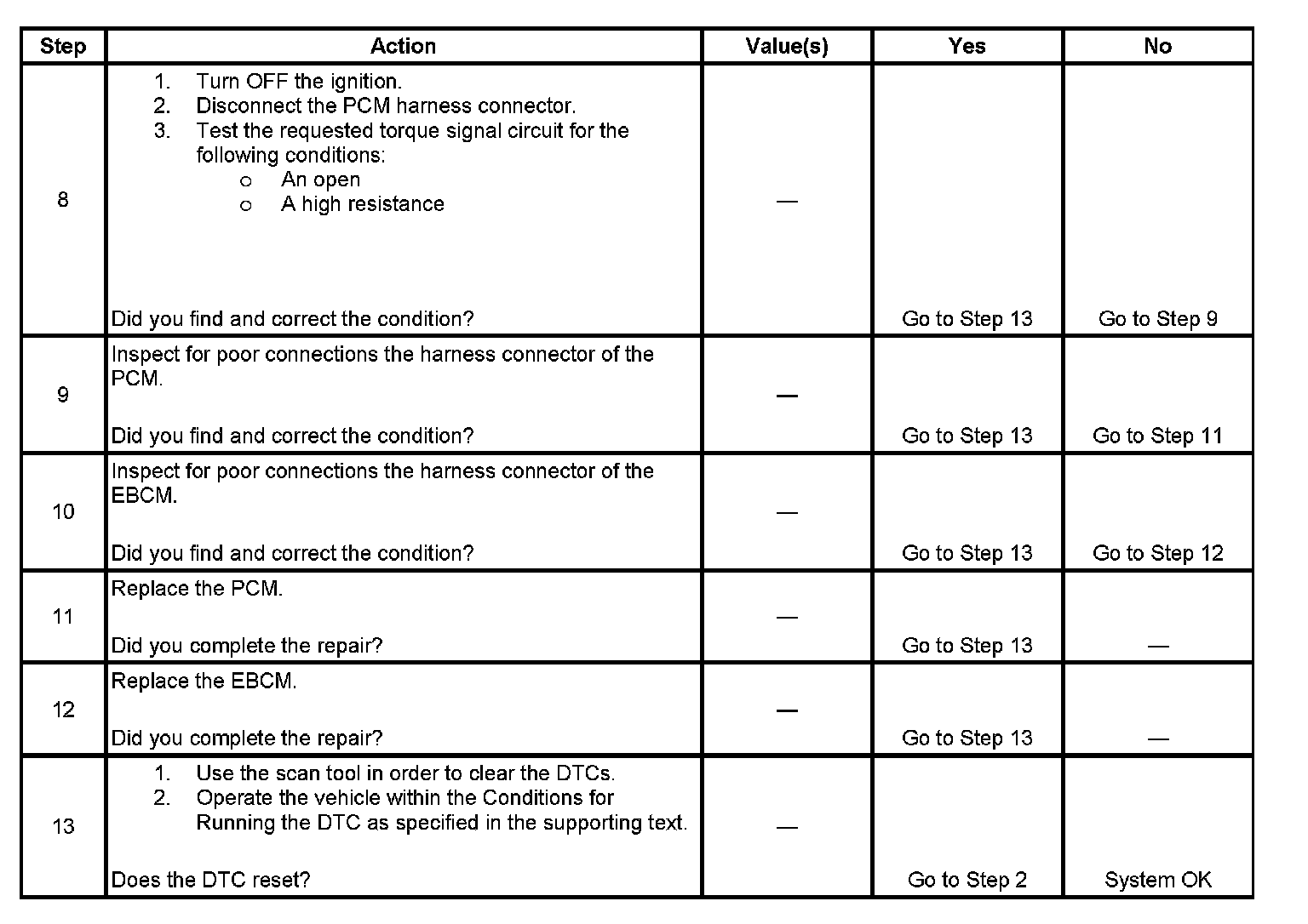 The PCM diagnoses the requested torque signal circuit and sends a serial data message to the EBCM indicating a fault is present.