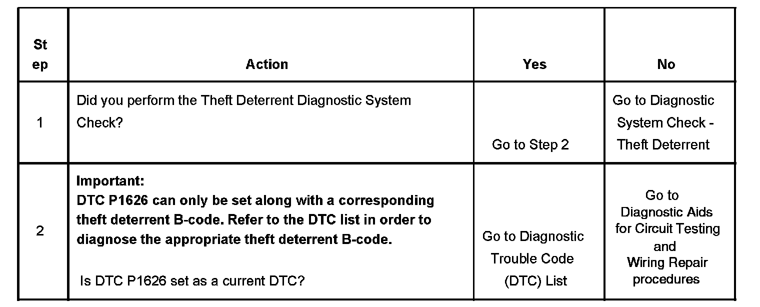 The body control module (BCM), produces the theft deterrent crank relay and fuel enable signal when ignition is ON and the proper ignition code voltage value is detected. The powertrain control module (PCM) monitors the fuel enable signal during crank. If the proper signal is present on the Class 2 Serial Data Circuit, the PCM enables the fuel delivery in order to allow the engine to start. If the PCM determines that the fuel enable signal is not present or incorrect while the engine is running, DTC P1626 is set. The engine continues to start and run as long as DTC P1626 is stored. If the problem affects inputs to the VTD signal, the starter motor may be disabled.