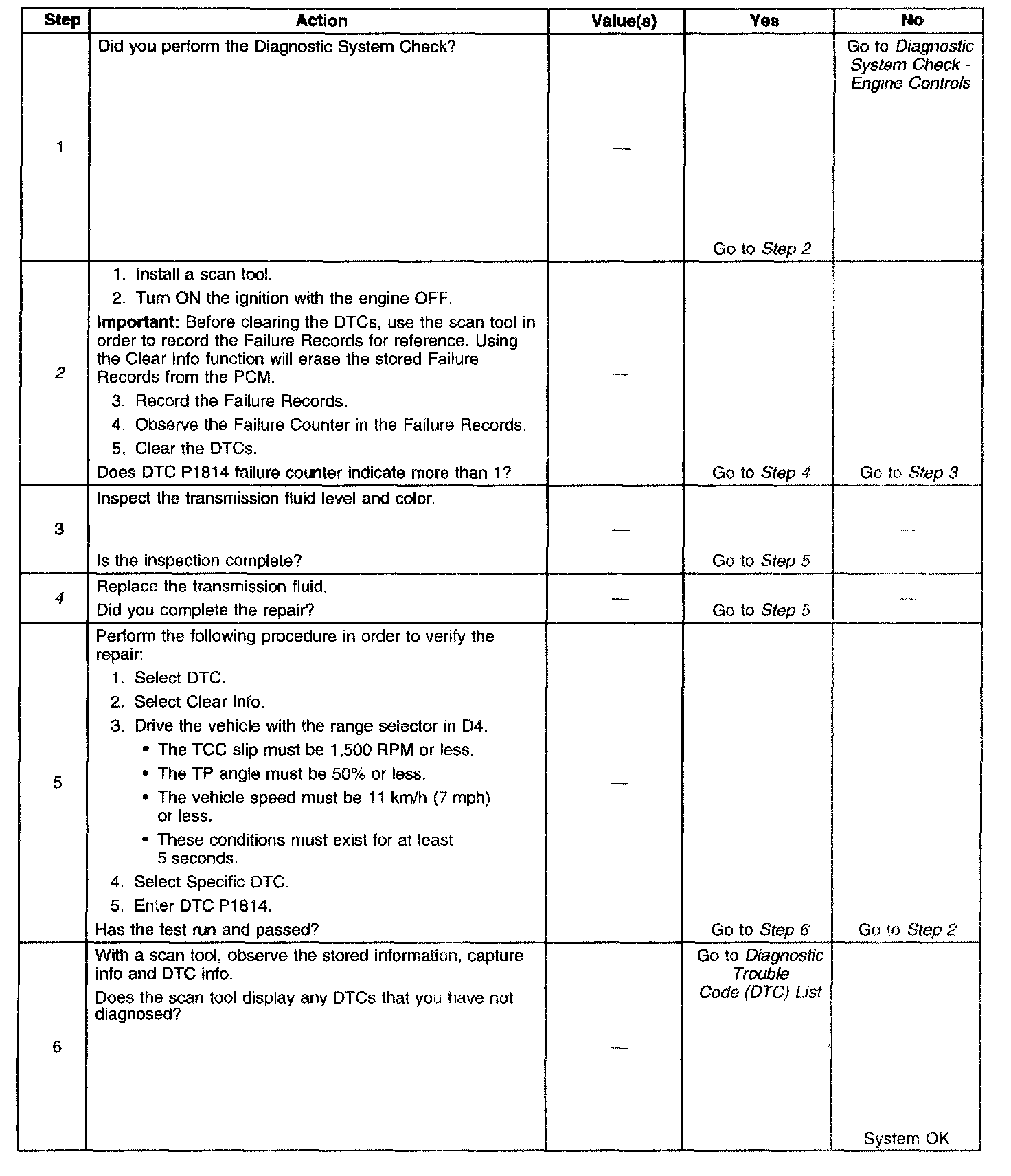 4. This step replaces the fluid and the filter. if DTC P1814 occurs more than once in the Failure Records, severe TCC damage may have occurred.