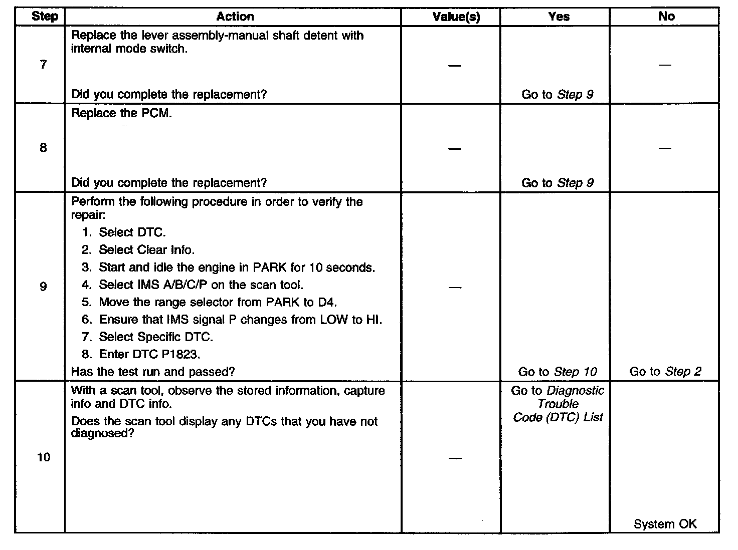 If the PCM detects that IMS Signal P is always low, then DTC P1823 sets. DTC P1823 is a type C DTC.