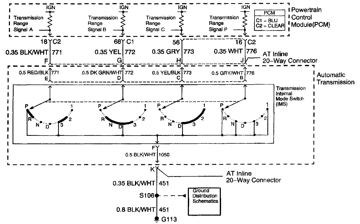 The transmission Internal Mode Switch (IMS) is a sliding contact switch attached to the selector detent inside the transmission side cover. The four inputs to the PCM indicate the position of the transmission range selector. The input voltage level at the PCM is high, B+, when the IMS is open and low when the switch is closed to ground. The four input parameters represented are Signals A, B, C and P - Parity.