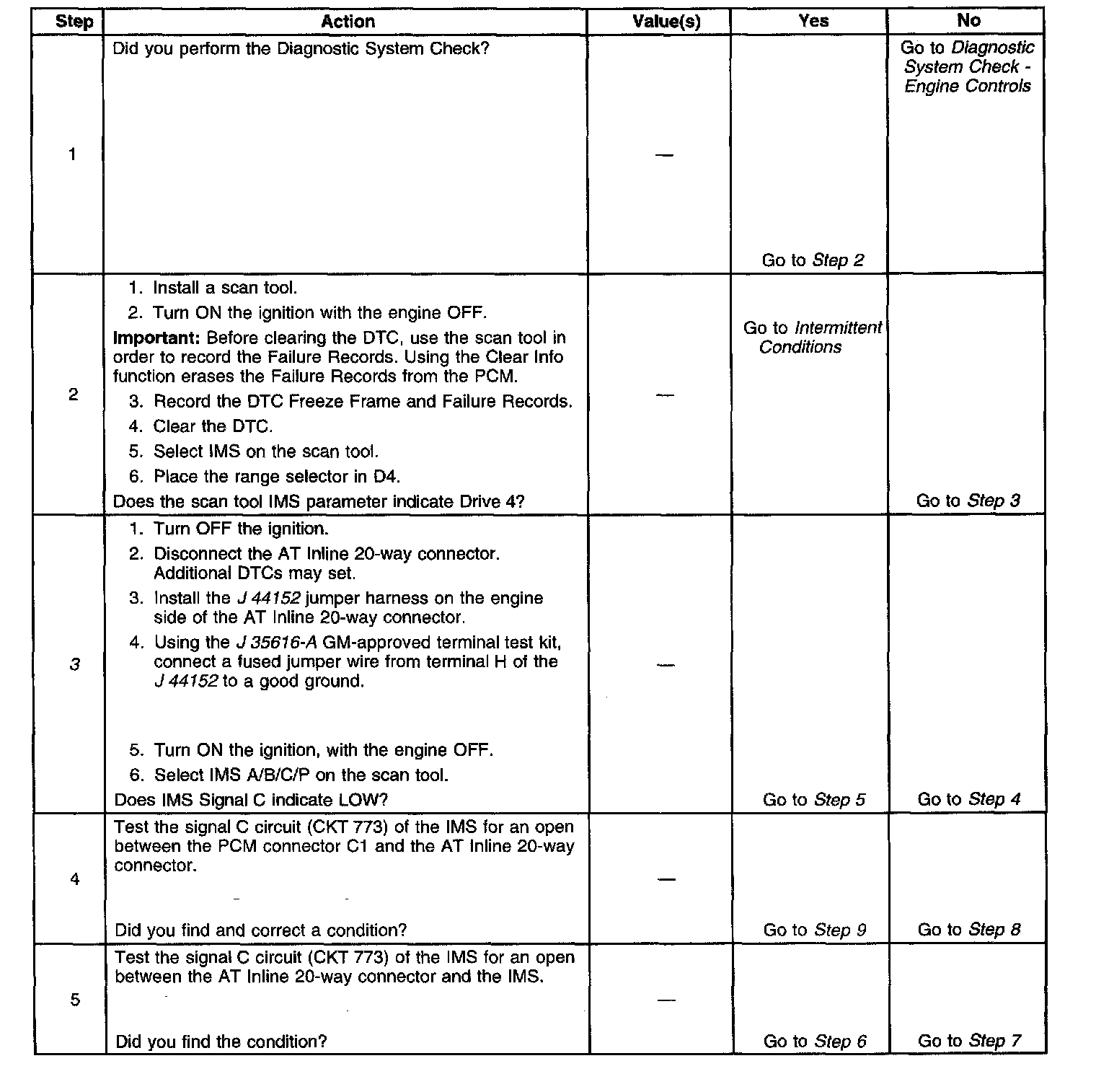 The PCM detects IMS Signal C is high, while the gear ratio indicates first, second, third or fourth gear for 60 seconds.