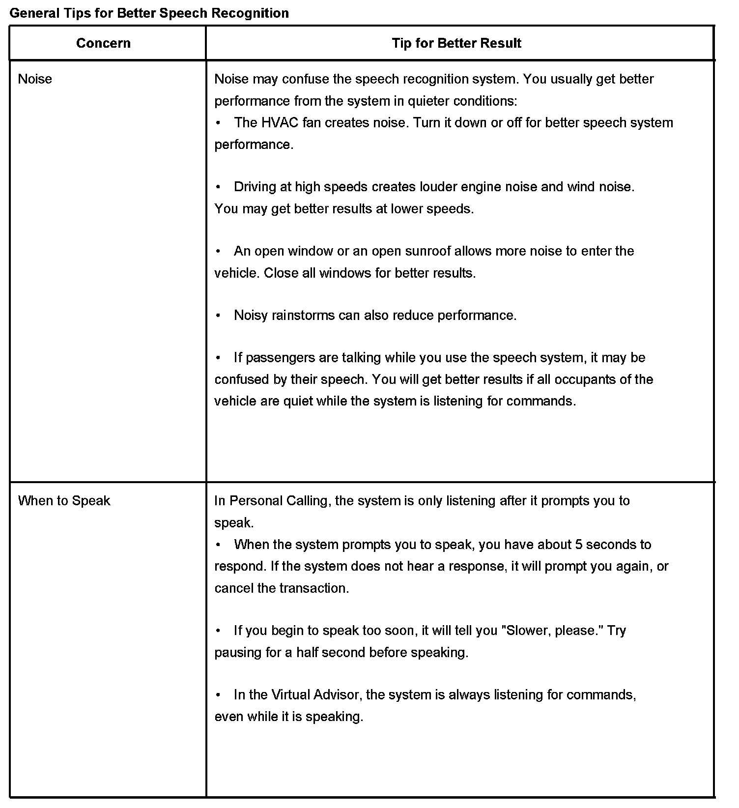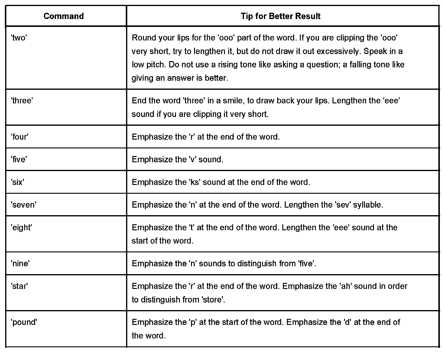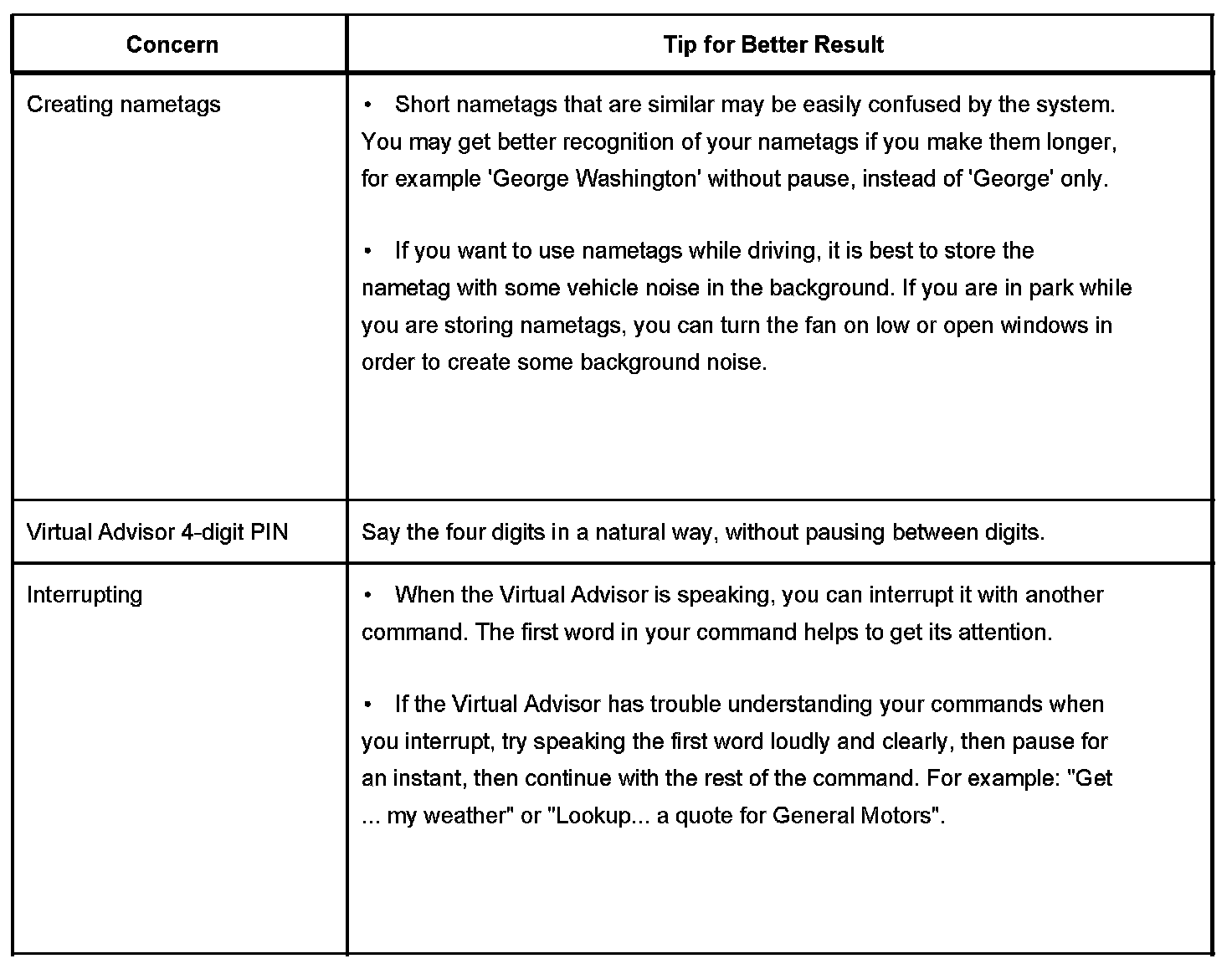 The OnStar(R) speech recognition systems use speech technology that is designed to understand a wide range of American English speakers. Although there is no one right way to speak English, the system will work best when users try to modify their pronunciation should they encounter difficulty. Users who do not obtain good results are advised to try the tips and workarounds found.