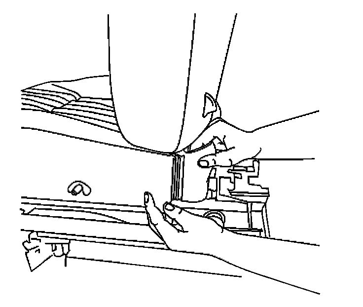 6. Disconnect the J-hook retainers at the rear of the front seat cushion and pull open the front seat cushion cover to expose the seat frame hinge.