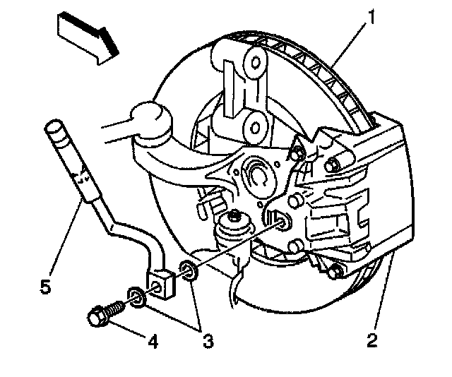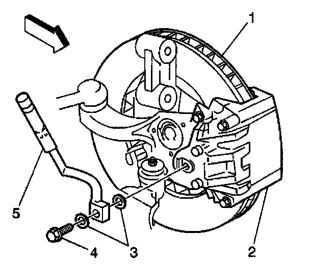 7. Remove the brake hose to caliper bolt (4) from the brake caliper (2).